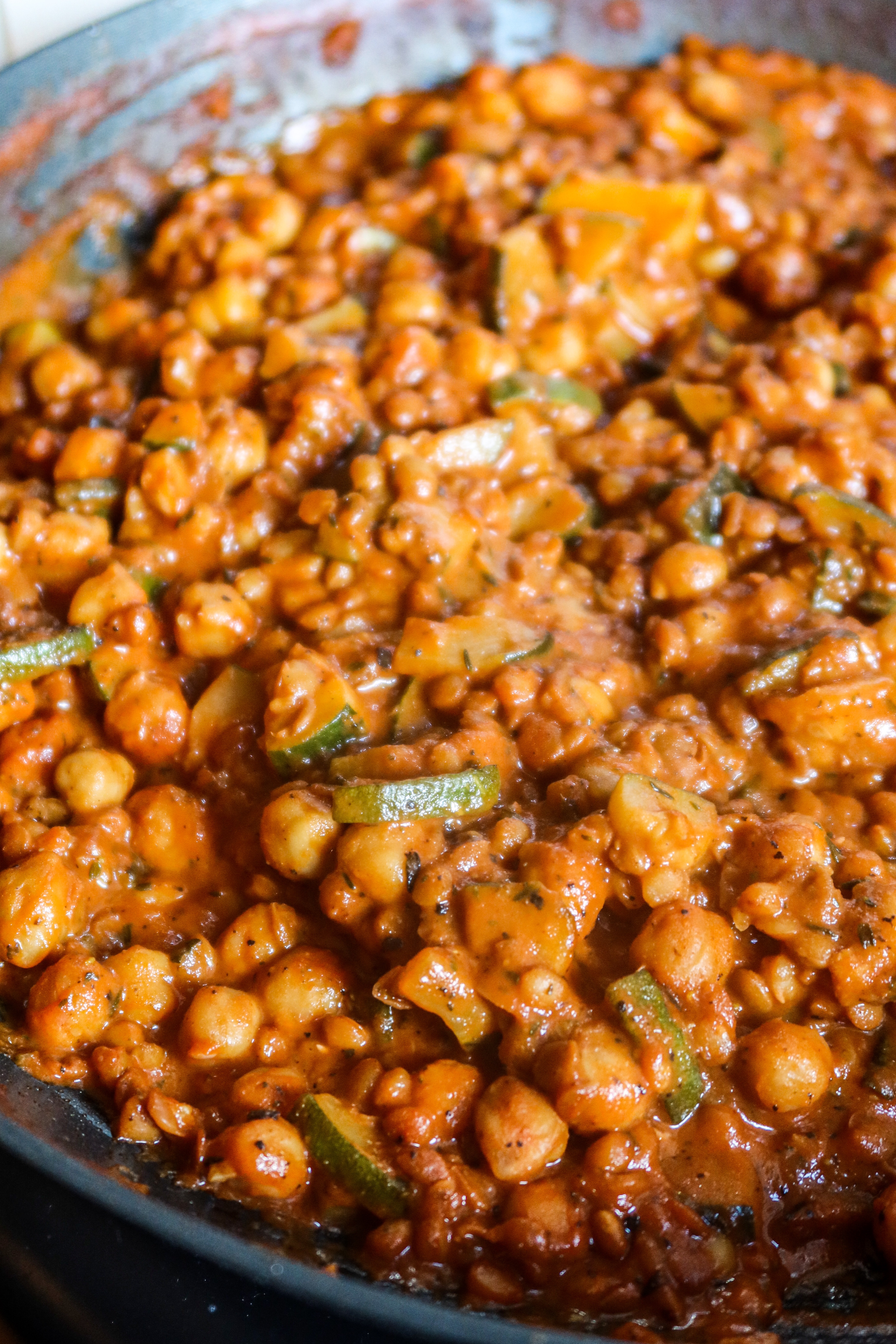 2) Tärna zucchinin. Ha i den också. Ha i alla kryddor. Häll av linser och kikärtor och skölj dem och häll även i dem.