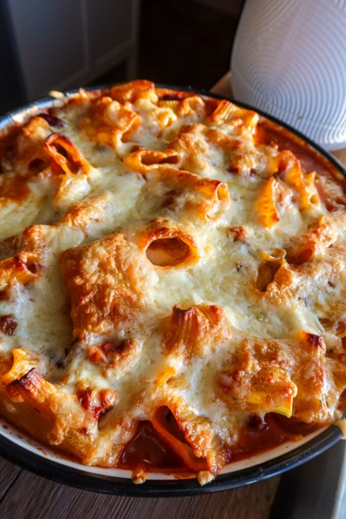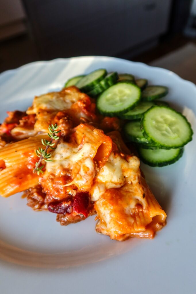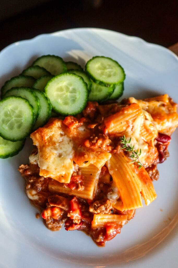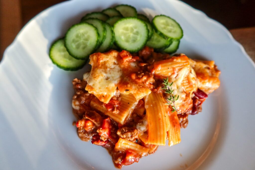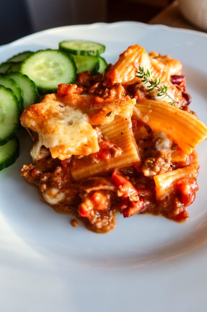 5. Häll pastan i en ugnsfast form, häll i köttfärssåsen, på med riven ost.