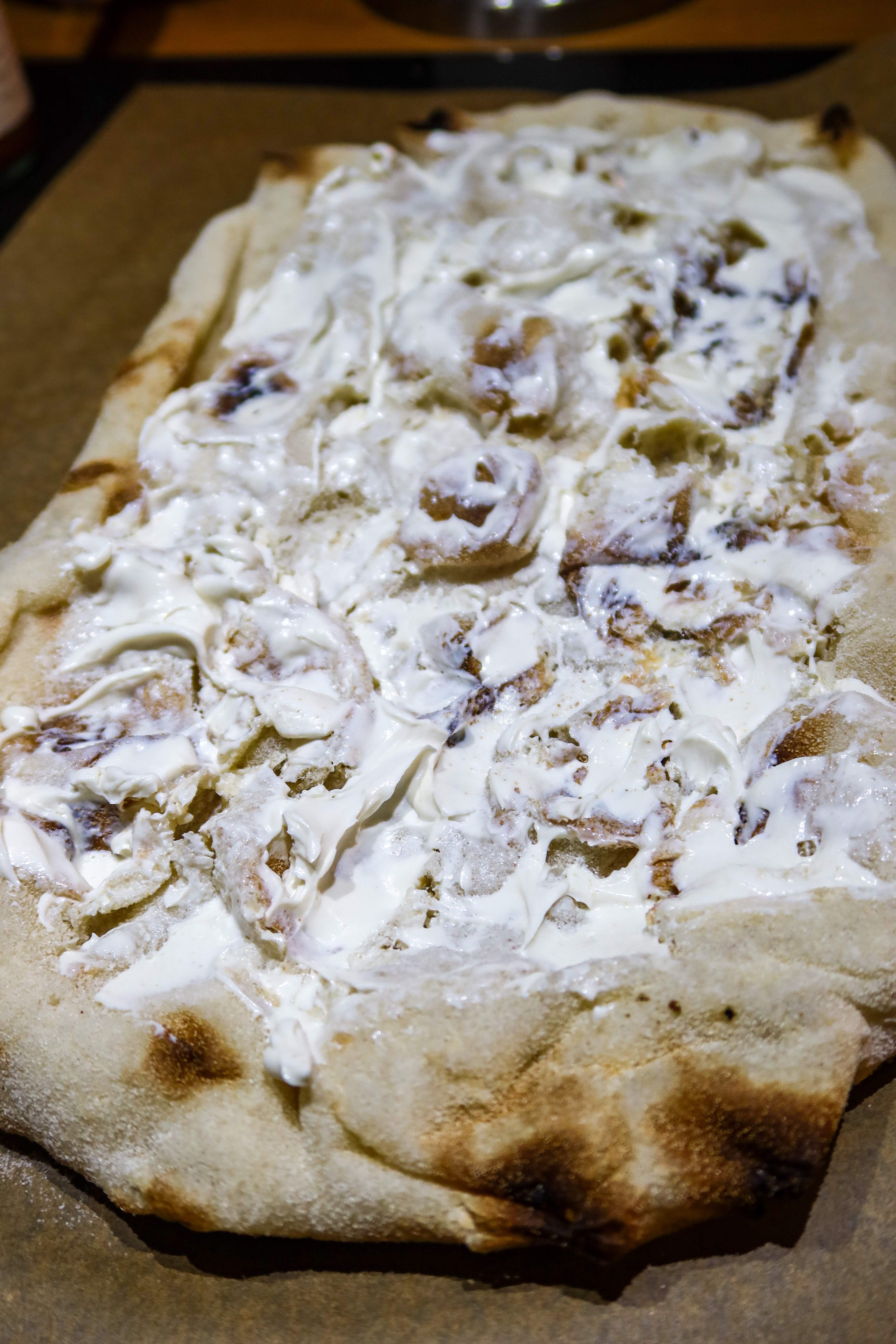 1) Bred på creme fraiche på pinsabotten. Riv på parmesan och ringla ca 1/2 msk honung på. Skjuts in i ugnen på 250 grader varmluft i ca 10 min. (Det står 5-7 min på förpackningen men jag tyckte inte det räckte.