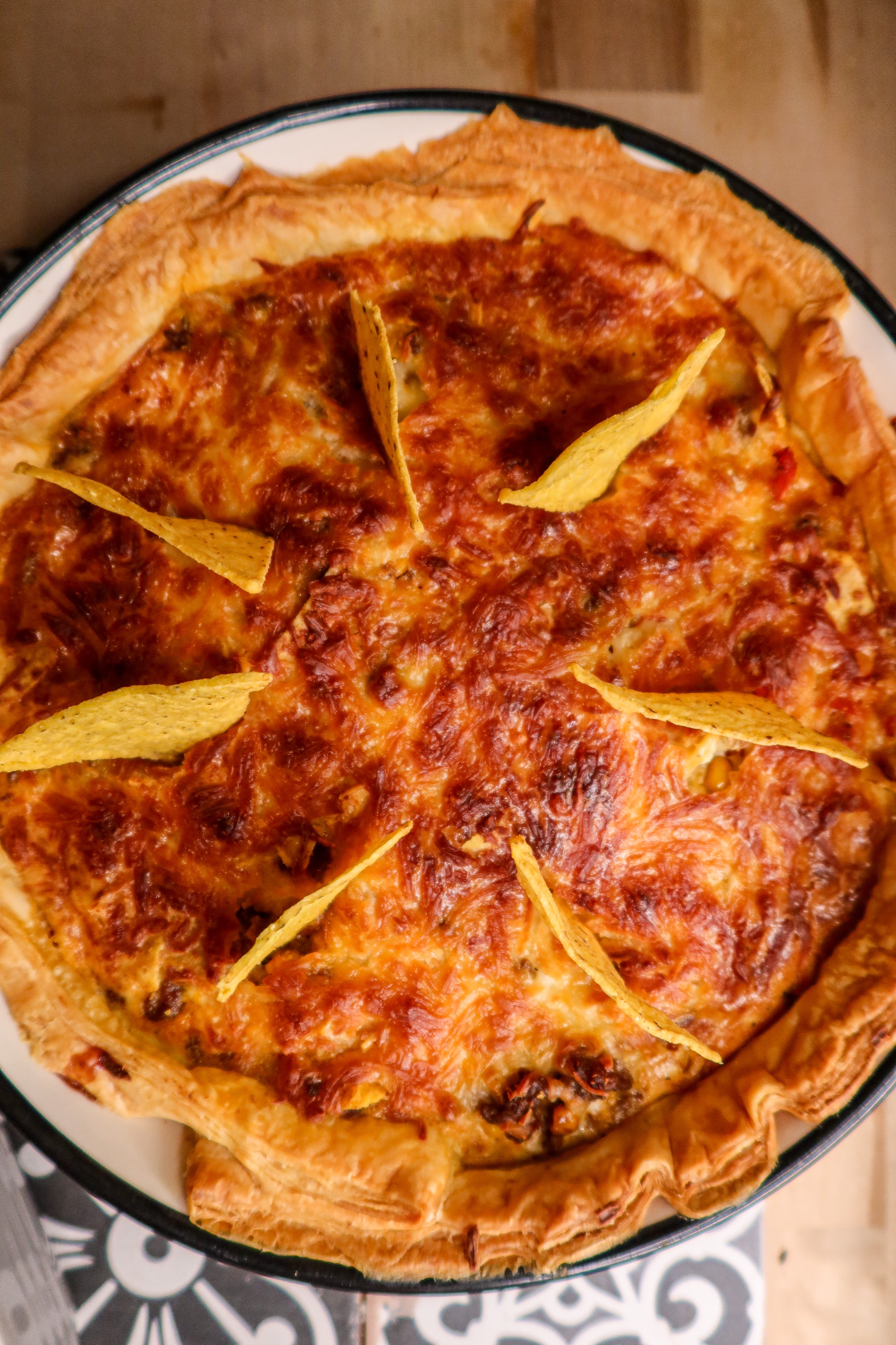 5) När du tar ut pajen sticker du i några tortillachips.