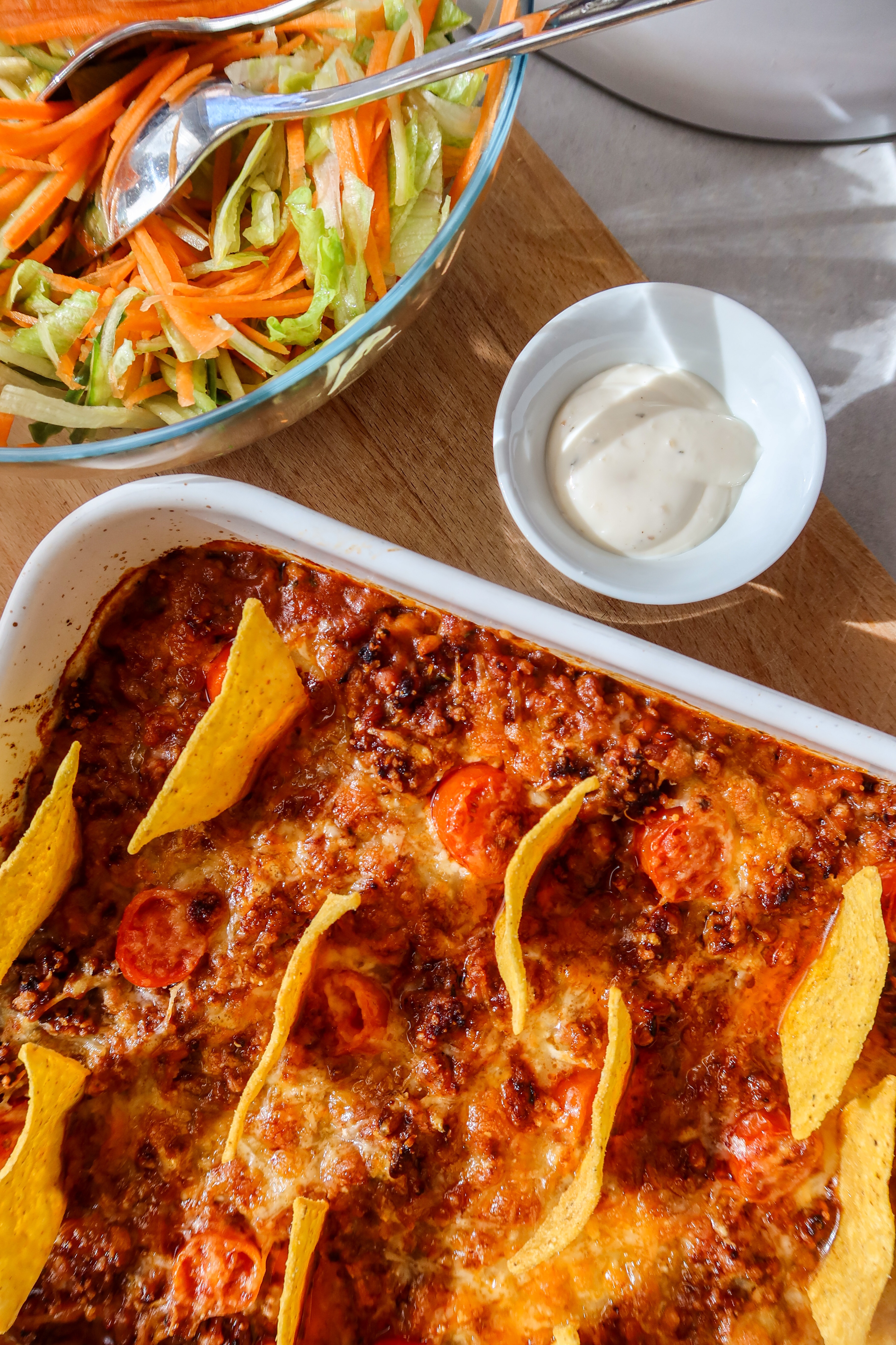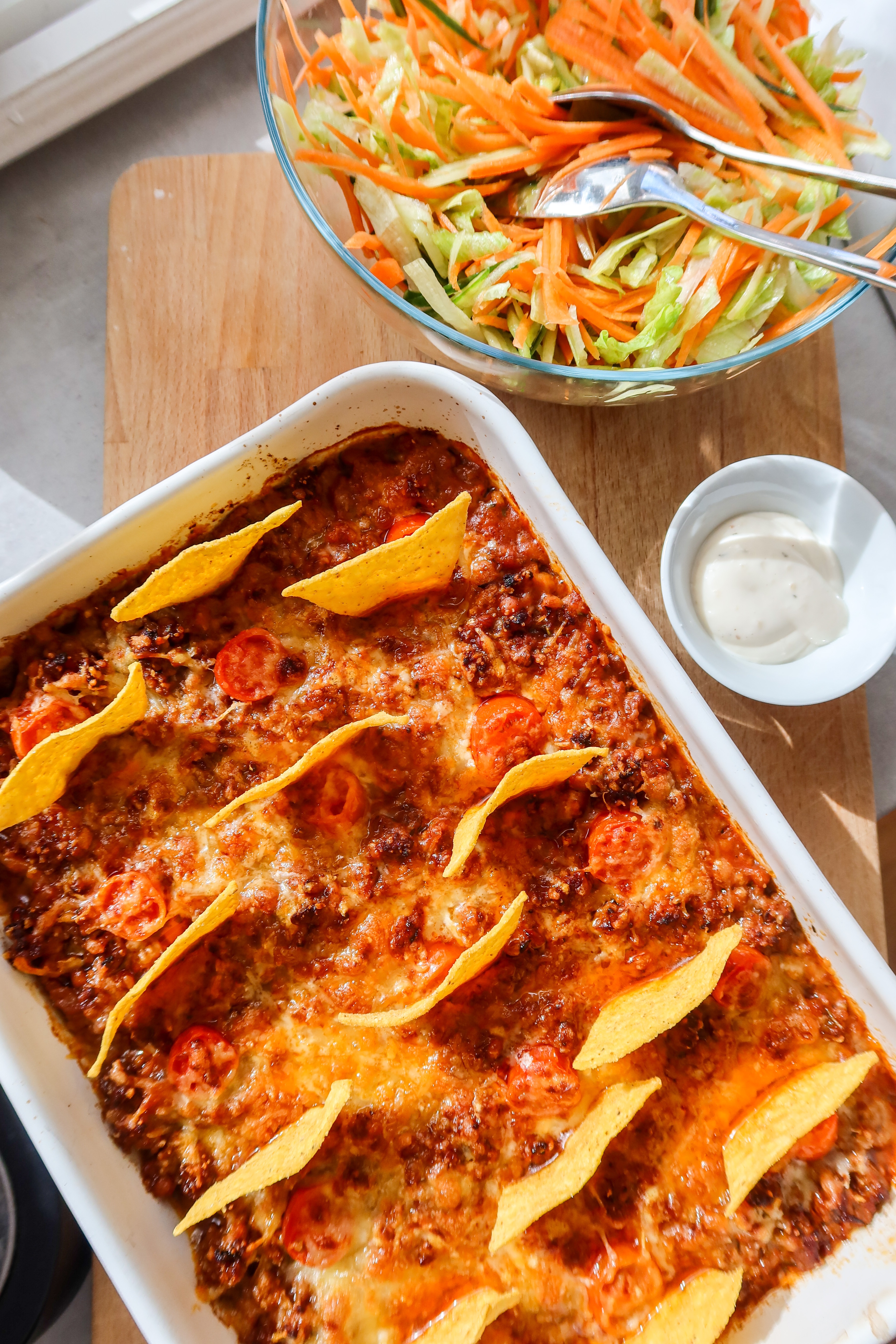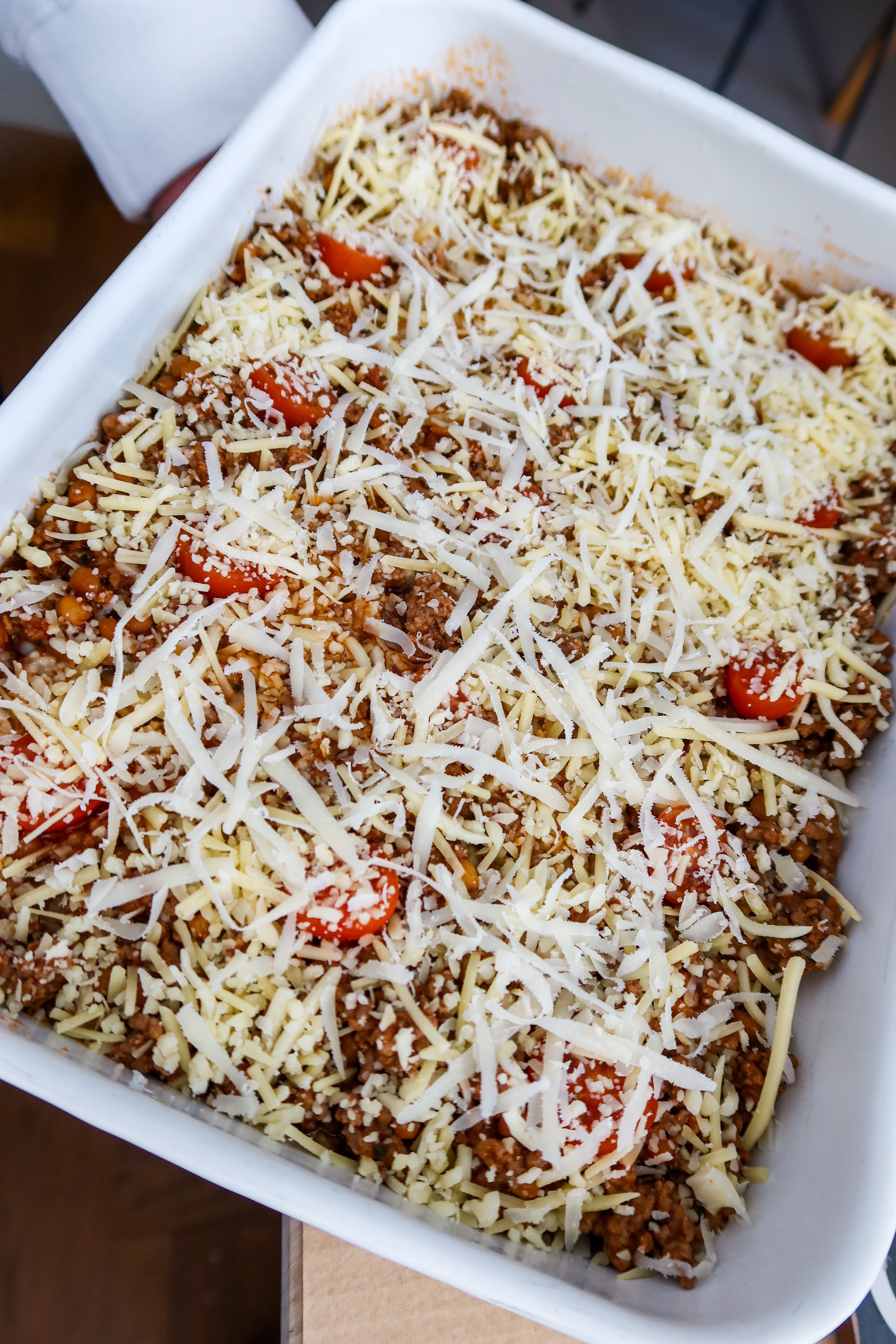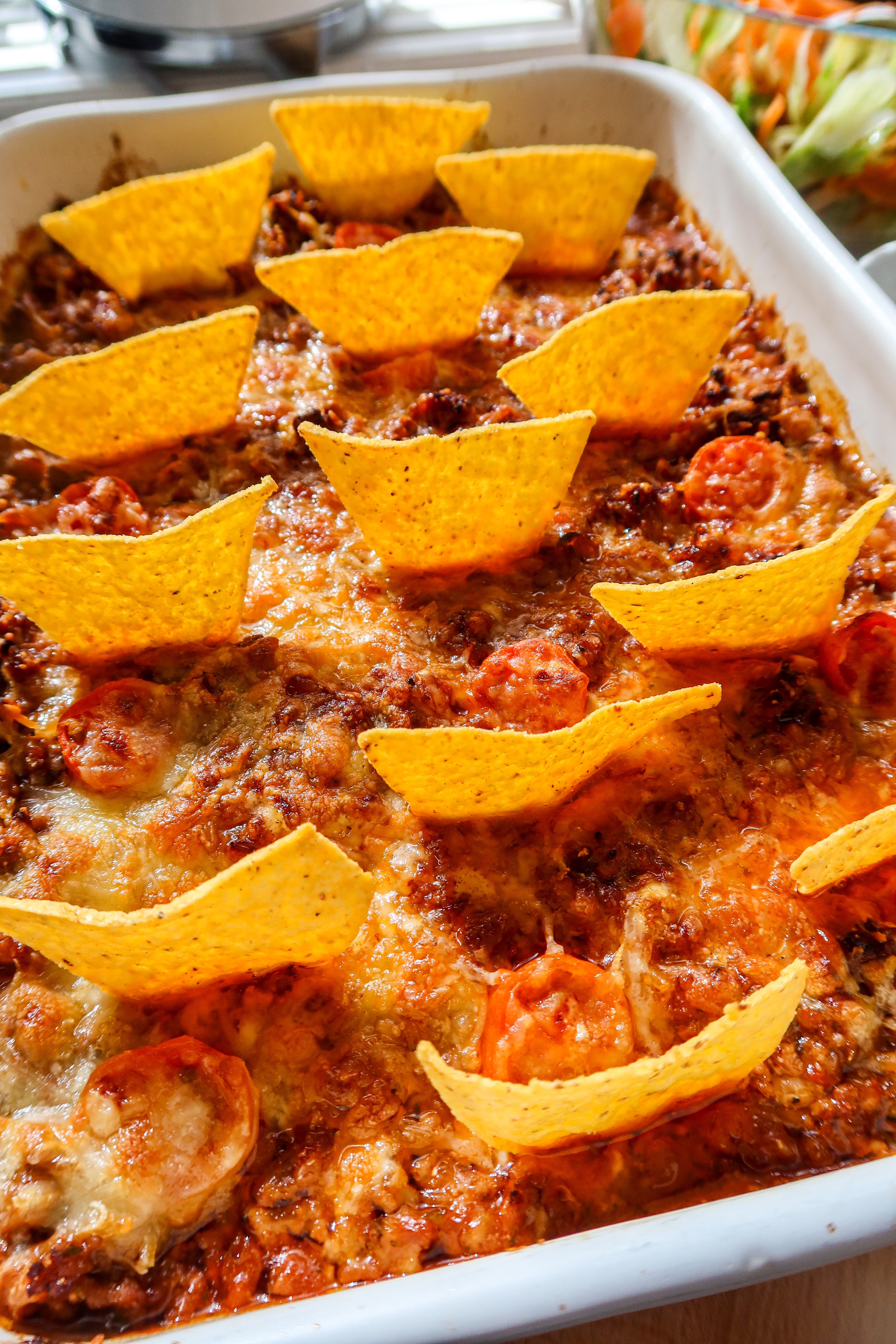 3) Häll i allt i en ugnsfast form. Dela cocktailtomaterna och ha på några. Toppa med riven ost och parmesan. Ställ ugnen på grillfunktion på hög värme och låt osten smälta och få lite färg. Ta ut och stick i lite tortillachips.