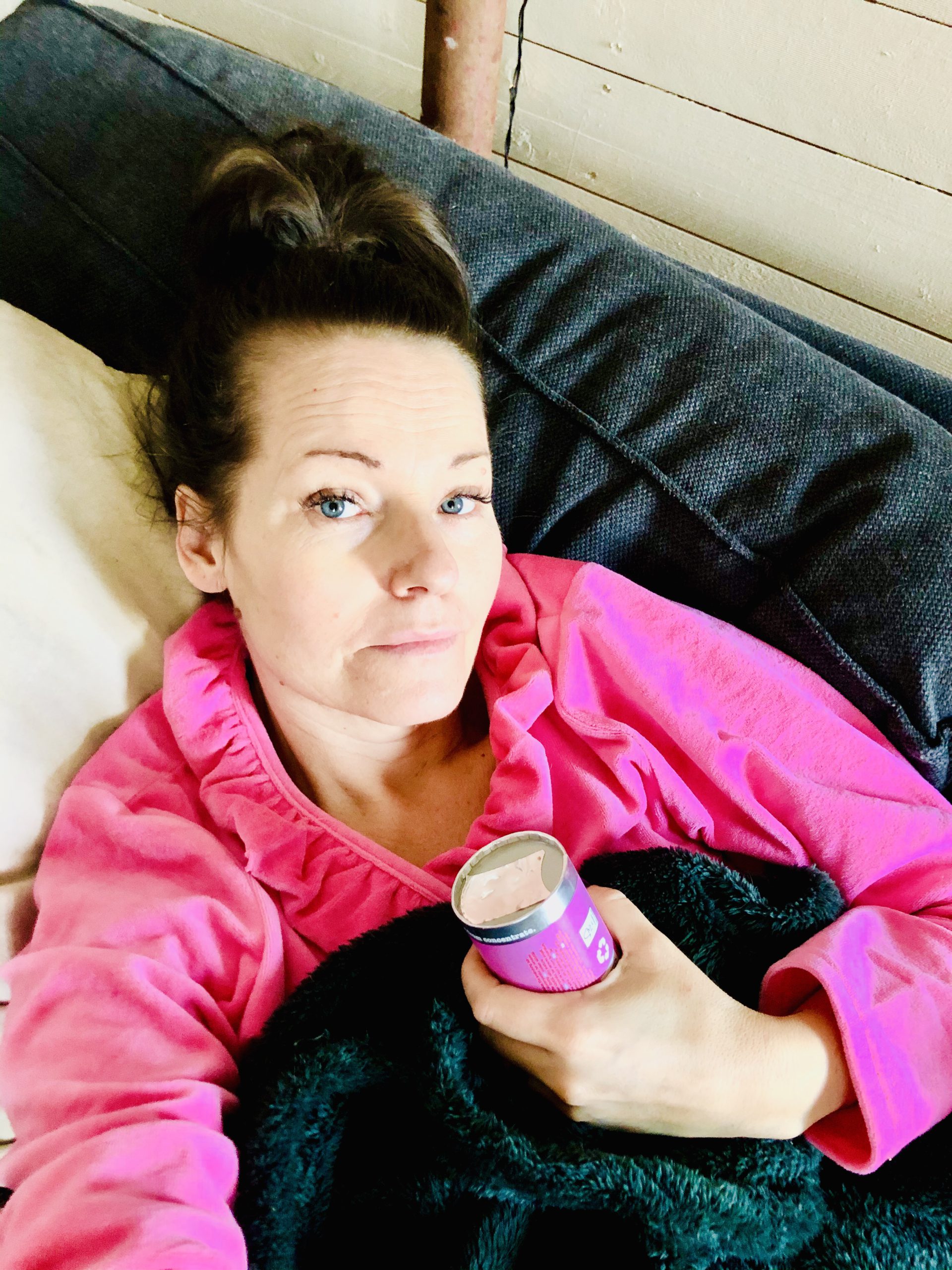 Tur att Frooshen matchar morgonrocken i en annars lite sliten bild. 🙈💕 Dricker några till frukost denna morgon, orkar inget annat känns det som. Tur jag har katten till sällskap, hon brukar kunna vara nära. Det är fint det, jag är nämligen så dålig på att vara hängig. Trivs inte själv då och vill helst ha familjen samlad. Så konstigt beteende det där med tanke på att man borde vilja vara ensam när man är krasslig. Nä, inte jag. Helst skulle hela klanen få vara här hemma med mig. Haha… så konstigt!