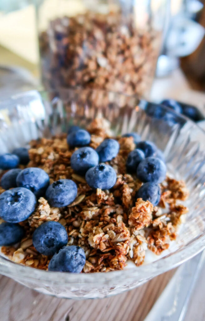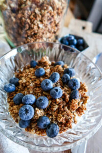 Denna morgon blir det hemgjord granola till frukost, den här är såååå god och endast sötad med banan. Vi alla tycker den är supergod! Höjdaren är när jag köper lite frystorkade hallon och har i, det är mums det! Serverar den ofta med färska blåbär – riktigt gott och inga konstiga tillsatser i. Kan verkligen rekommendera dig att göra egen granola, så värt och så mycket godare!