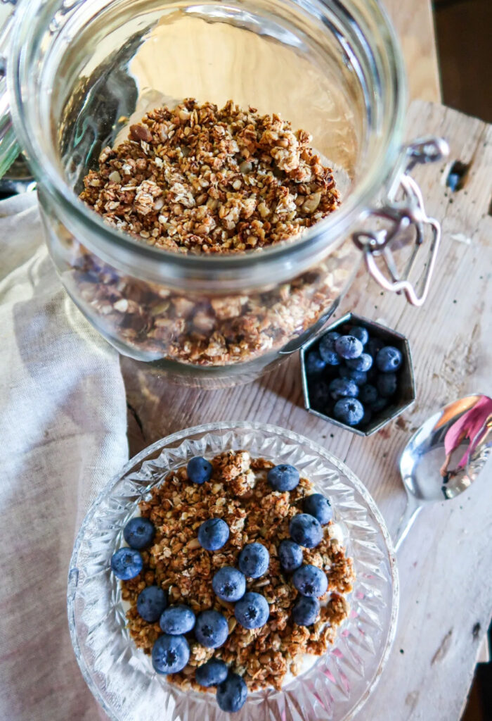 Jag förvarar granolan i en glasburk med lock, upplever dock att den är godast och håller sin knaprighet bäst om det inte är ett tätslutande lock. Jag har den i en sån här burk som du ser ovan, men vickar liksom bara igen locket utan att stänga det helt.