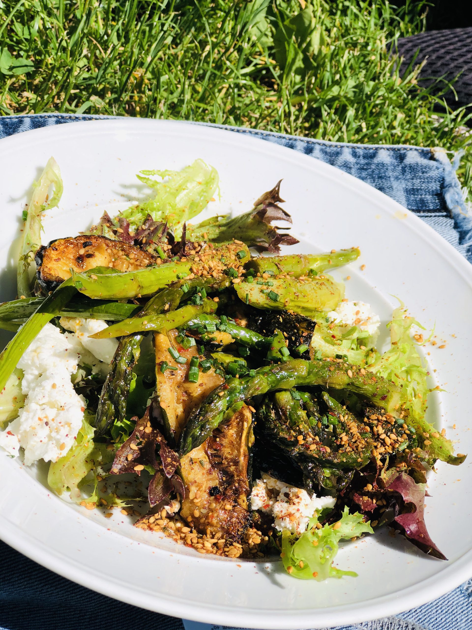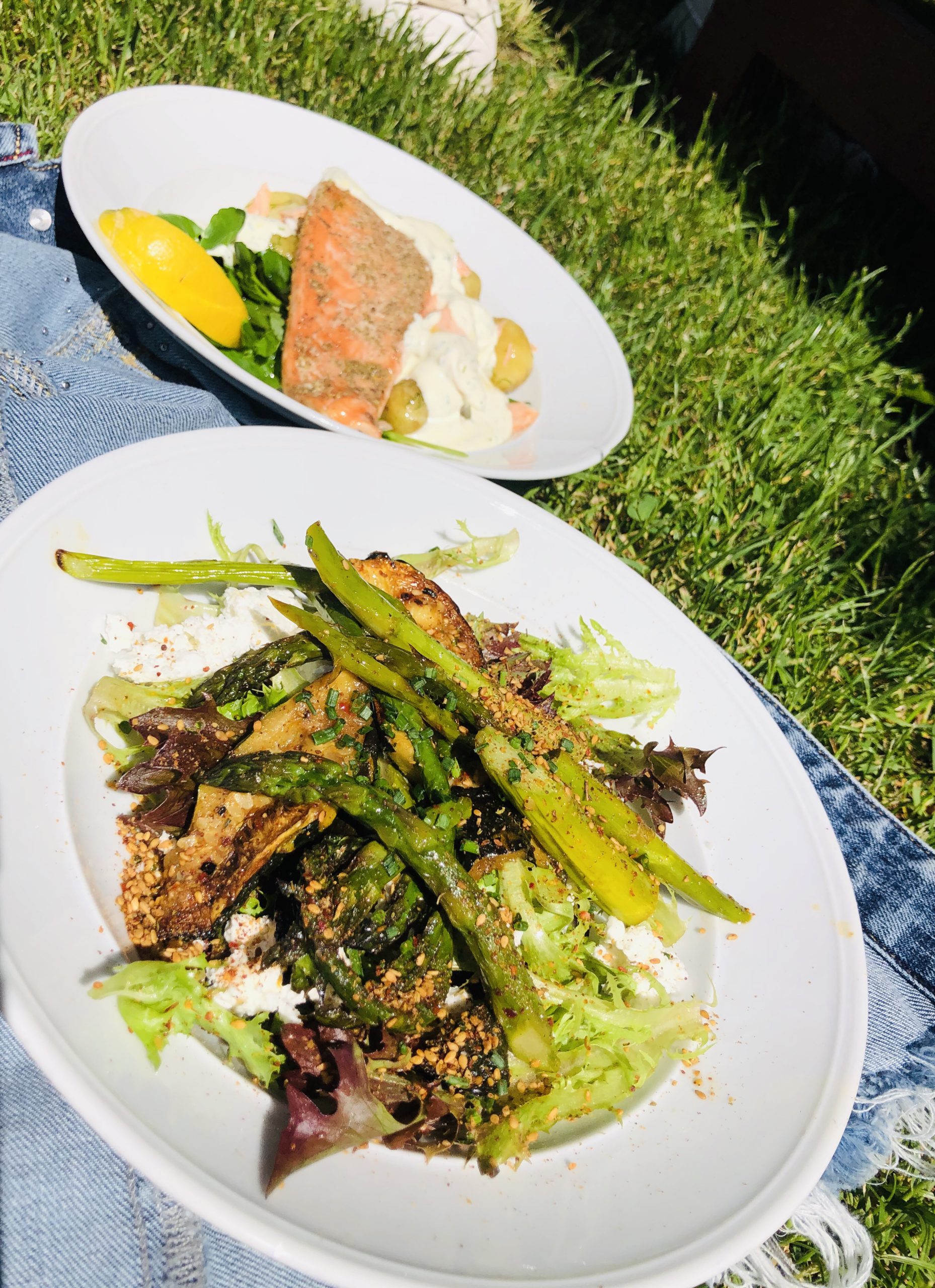 Här satt vi länge och bara njöt. Jag åt en sparrissallad och Milo och Tony åt en varsin varmrökt lax. Sen hann vi också med en fika innan vi gick vidare. Många sitter på filtar här och myser, man sitter under maaaassor av äppelträd.