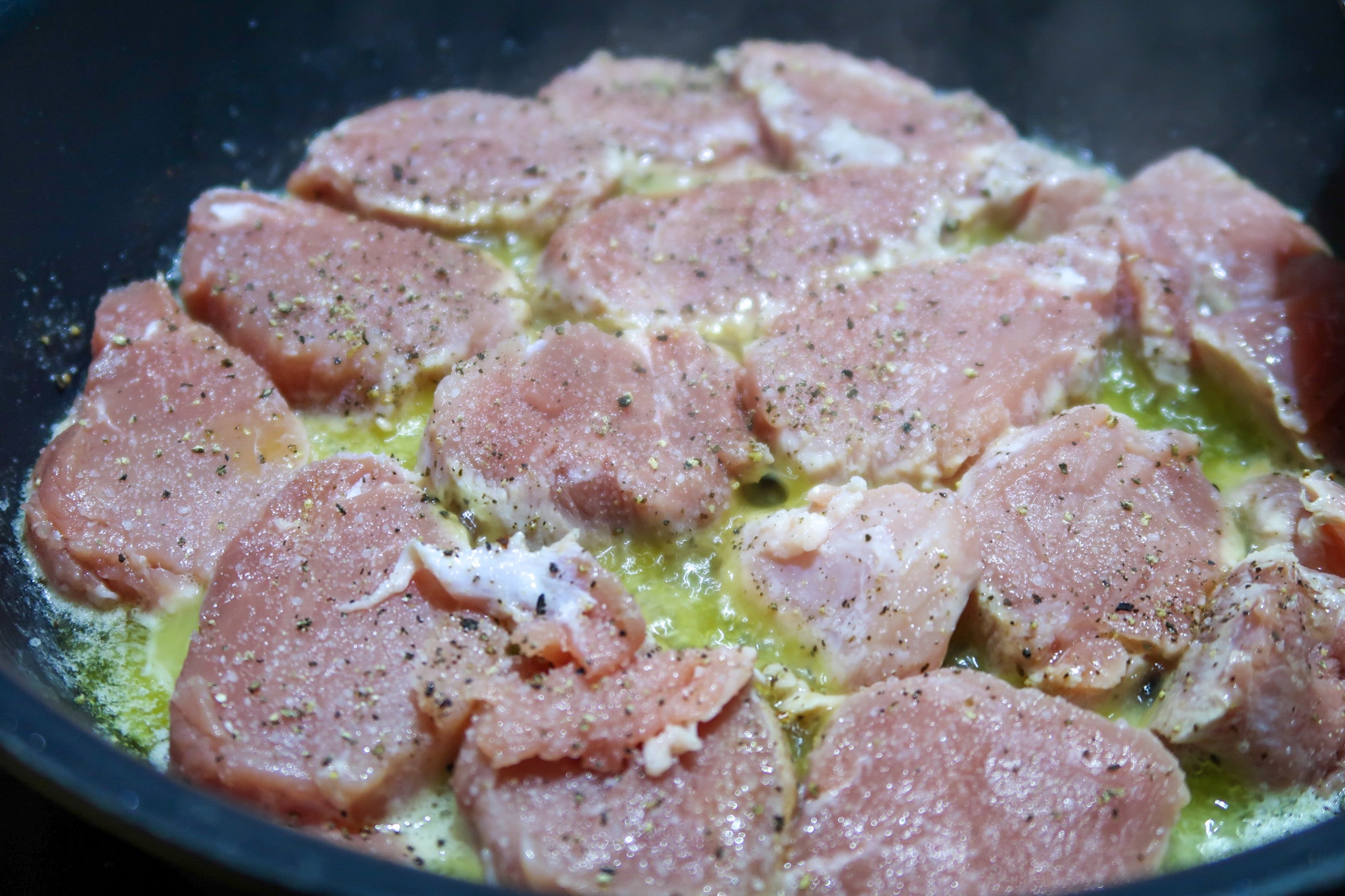 1) Rensa och skiva fläskfilén i skivor. Salta och peppra skivorna. Stek dem i smör på ganska hög värme. De ska få lite färg. Lägg sedan i ugnsfast form.