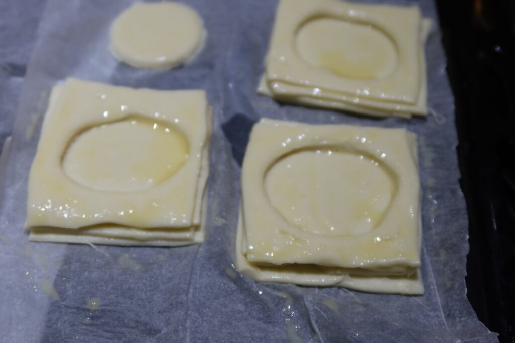 2. Sedan delar du upp smördegen i 28 rutor. Därefter lägger du dem uppepå varandra 2 och 2. På hälften av rutorna stansar du sedan ut ett hål, jag tog en kakutskärare. Sedan placerar du de fyrkanterna på hålet på de utan. Pensla med uppvispat ägg. Här ovan ser du hur de ser ut när de är penslade och klara.