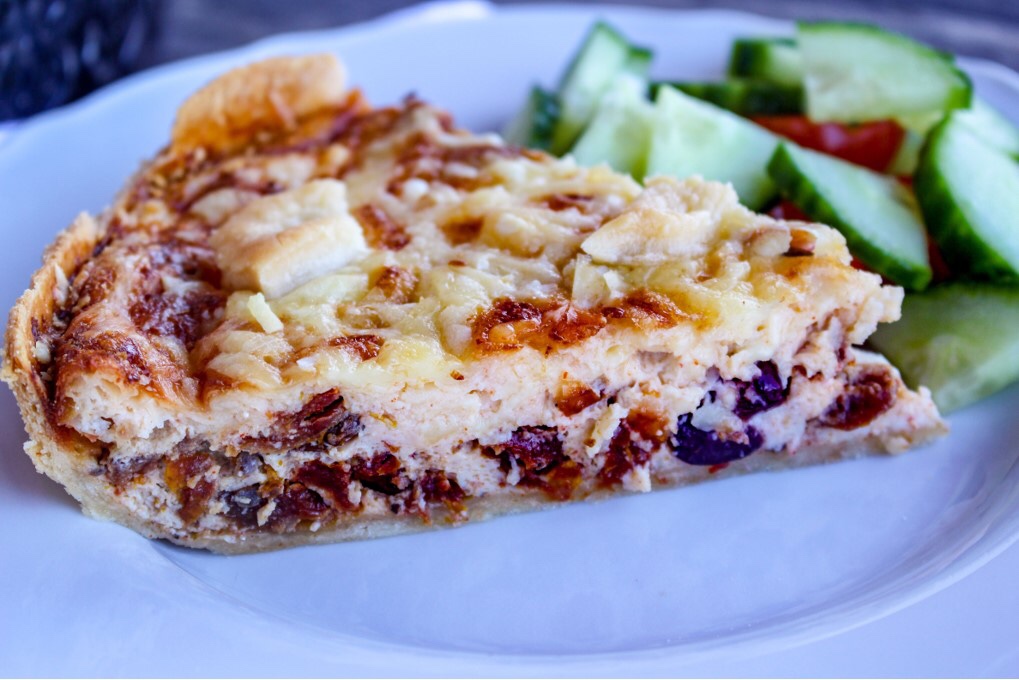 3) Skär soltorkade tomater i mindre bitar, dela också oliverna. Ha i allt i äggstanningen. Häll det över pajen.