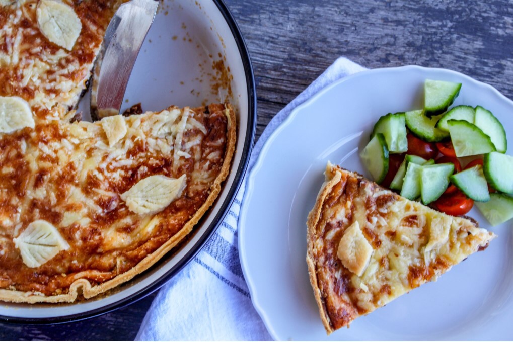1) Lägg pajskalet i en pajform. Picka botten med en gaffel. Förgrädda i ca 15 min på 200 grader.