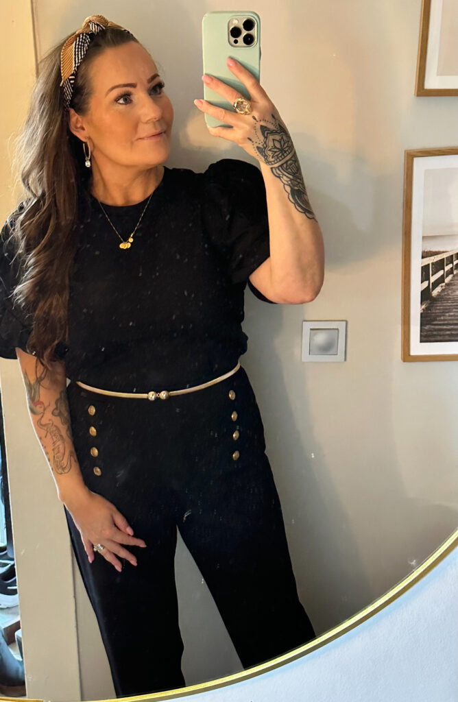 En favoritoutfit. Tröjan är superskön, som en vanlig t-shirt fast med finare ärmar. Byxan använder jag supergoda, en härligt skön resår i midjan bara så dom är ätarvänliga också. 😝 Bältet är superfint i guld med stretch så det är one size. Snyggt att ha till klänningen, blusen eller som jag här på bilden. Scarfen köpte jag på Kapp-Ahl men den var slutsåld, däremot har de många andra fina. Kolla HÄR.