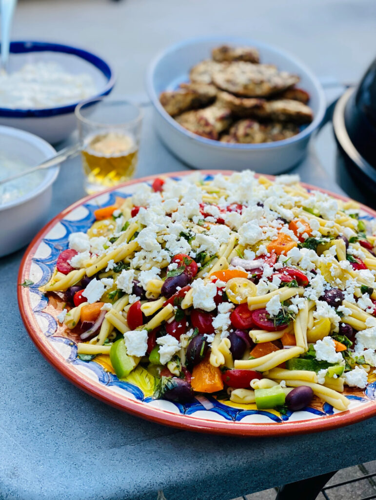 2) Pastasallad: Koka pastan enligt anvisningarna. Kyl av i kallt vatten. Blanda ihop med smulad fetaost, tomater, paprika, rödlök, oliver, örter, olivolja, citronsaft och svartpeppar.