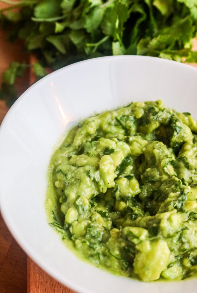 1. Mosa avokadon ordentligt, hacka koriandern smått. Föredrar du däremot lite större bitar så hacka den större. Ha i allt i en skål.
