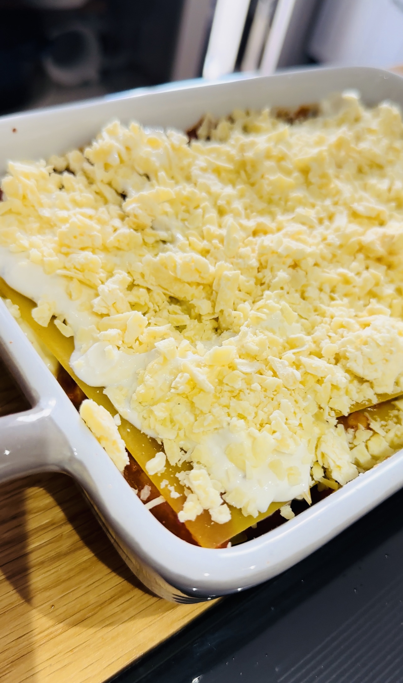 4) Ta fram en ugnsform på ca 20×15 cm. Börja med att ha i grönsaksröran i botten. Fördela ut lasagneplattor så de passar som nästa lager. Därefter varvar du med fetaoströran uppepå. Sedan på med lasagneplattor igen. Så gör du och avslutar sist med fetaoströran och riven ost uppepå det.