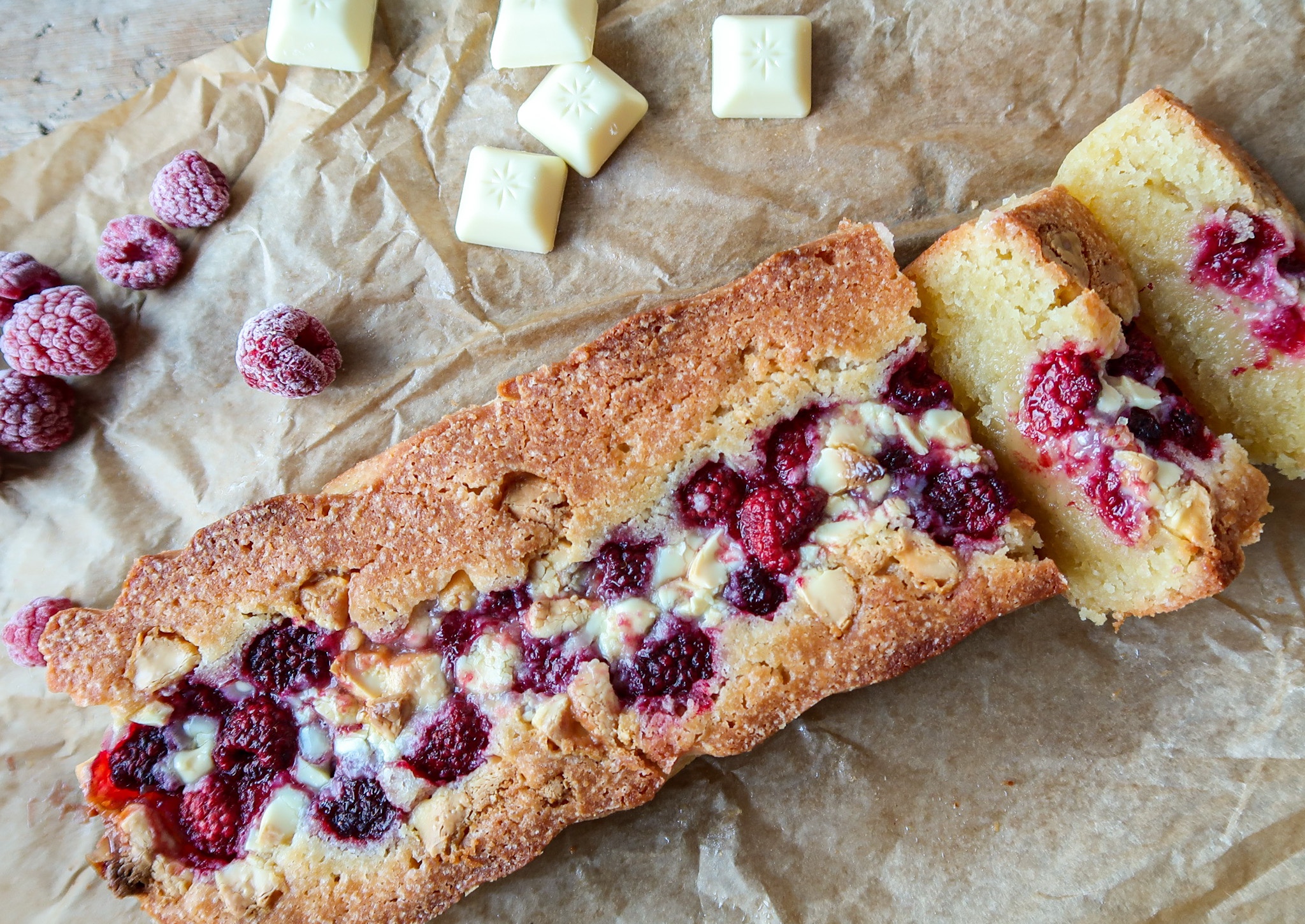 4. Klä en brödform på ca 1 – 1,5 l med bakplåtspapper. Häll i smeten. Ha i hallonen i mitten av kakan och avsluta med att hacka på lite vit choklad.