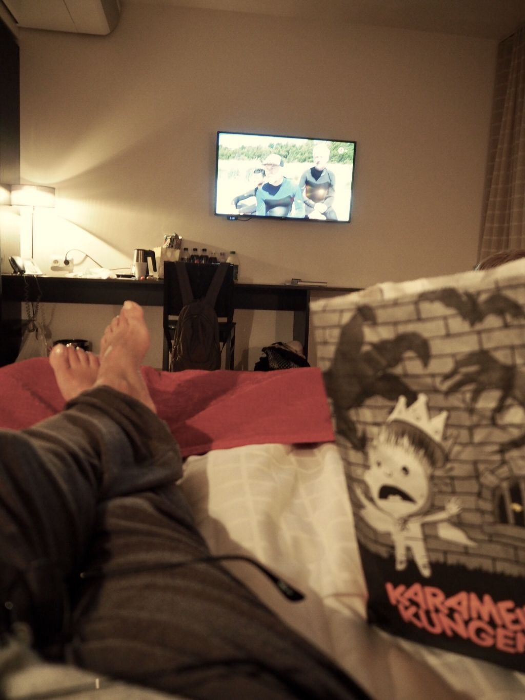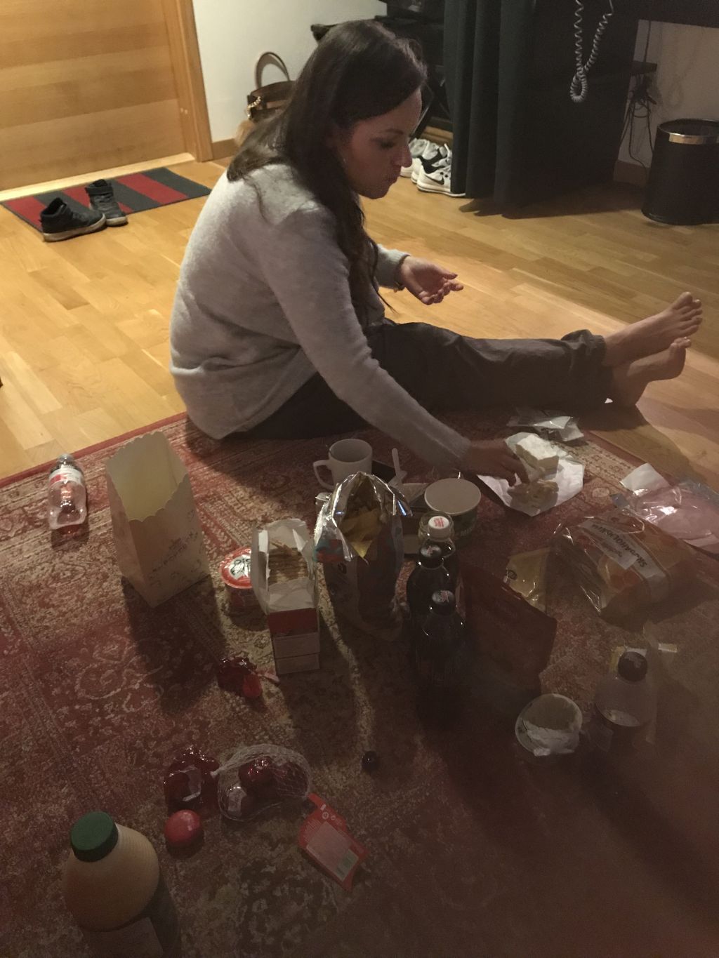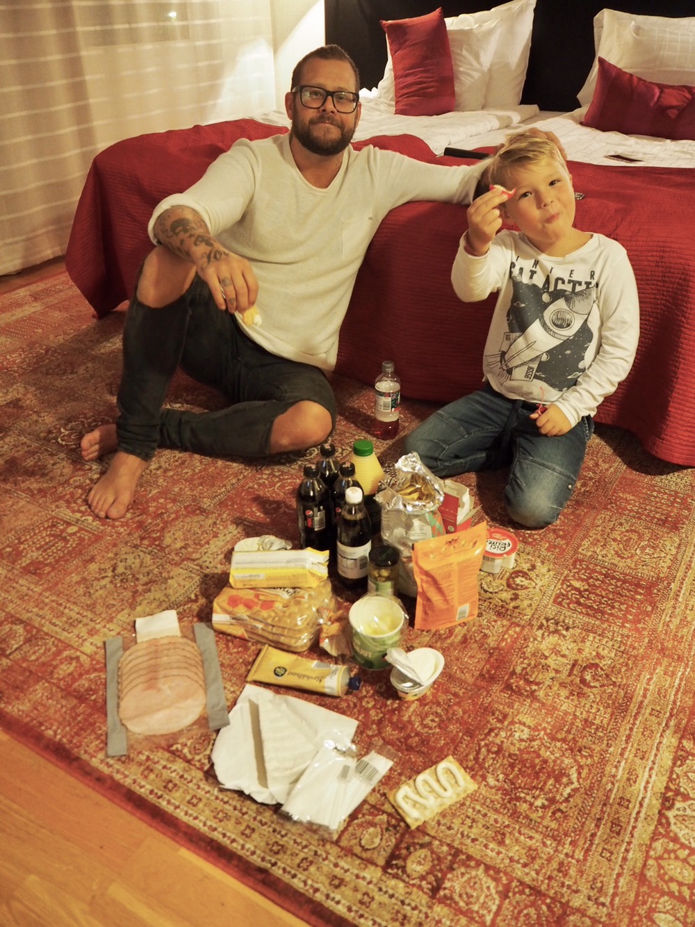 Eftersom vi inte orkade leta matställe, ville inte missa bra på TV och alla var lite trötta gick vi till ICA som låg precis bredvid och köpte picknick istället. Dukade upp det på golvet och sedan kollade vi ”Så mycket bättre”. Riktigt mysigt faktiskt! Kom dock på efter jag tog bilden att jag nog inte kunde äta mackan som legat på mattan. Tänk allt fotguck som gått där….haha! Fick kasta och göra ny.