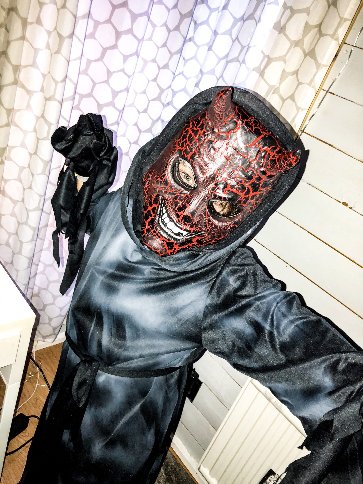 Hans djävulsdräkt är så klockren. Han har gått här hemma och sagt att han aldrig haft en bättre dräkt. Sötisen. Masken har batterier och han har som en fjärrkontroll med sladd under dräkten som han kan tända masken med. Då lyser den sådär läskigt. Ser nästan ut som om den glöder.