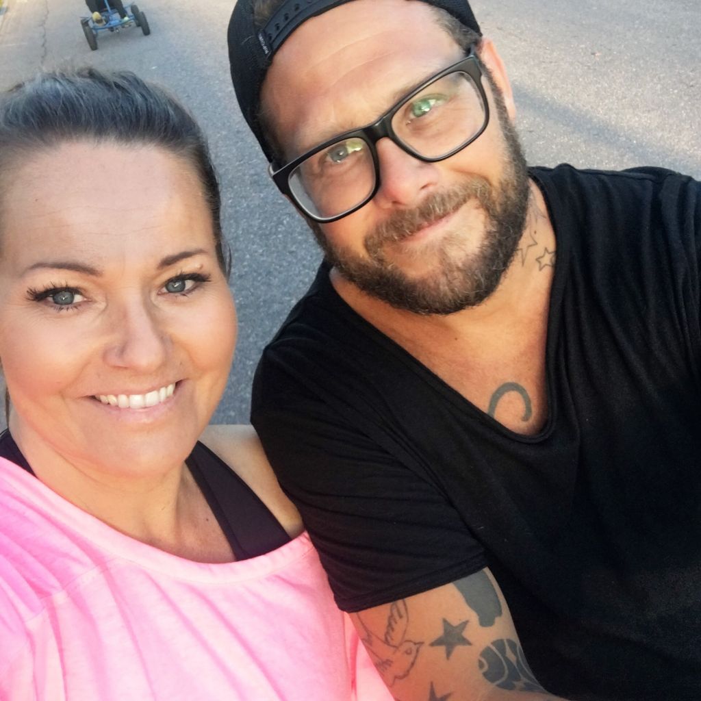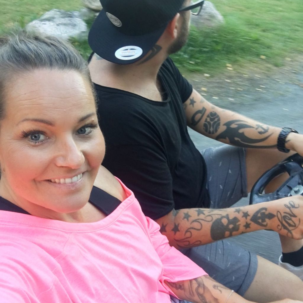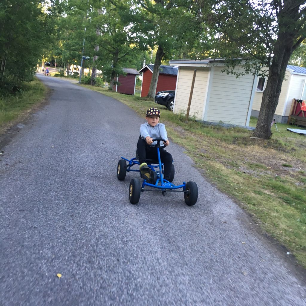 Vi har också hunnit med att vara ena riktiga campare idag. Vi hyrde såna trampcyklar och cyklade runt hela campingen. Skrattade så jäkla mycket när jag såg att Milo visade tummen ner på bilden som Tony försöker få det att se ut som att han håller Milo mellan sina fingrar. Gick ju sådär med det…. Det var riktigt roligt i alla fall, jobbigt också när vi skulle upp för backarna.