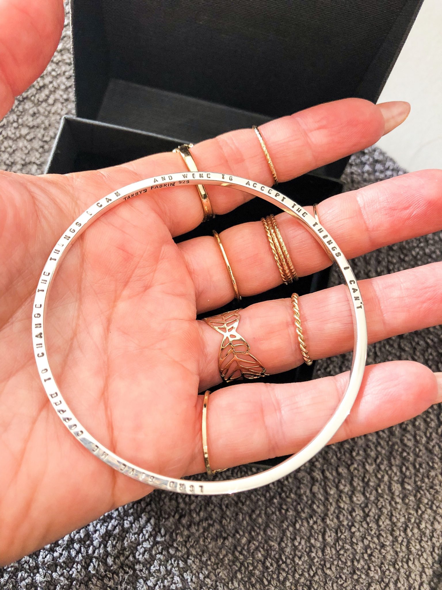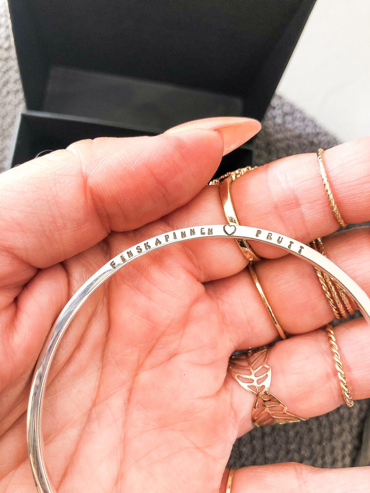 I present av oss fick hon ett armband där det står ”Lord give me coffee to change the things i can and wine to accept the things i can’t”. Sen står det ”Finska pinnen Prutt”.