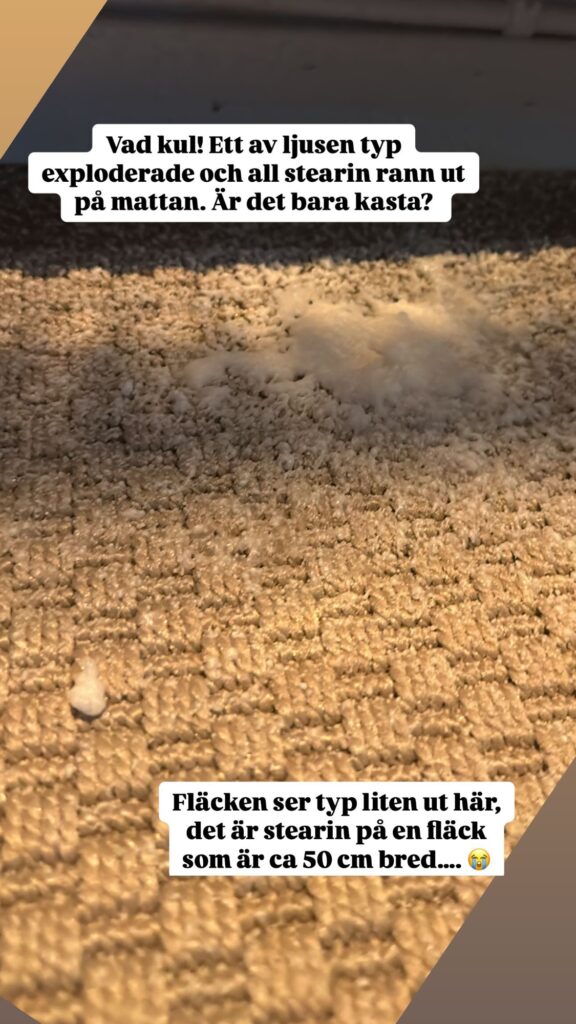 Till min stora fasa så hade ljusets ena sida liksom exploderat eller vad man ska säga, vilket gjorde att all stearin rann ut på mattan under. Detta är vår matta som vi har under matbordet. Fick tips om husmorsknepet för hur man tar bort stearin bäst, och galet nog fungerade det hur bra som helst.