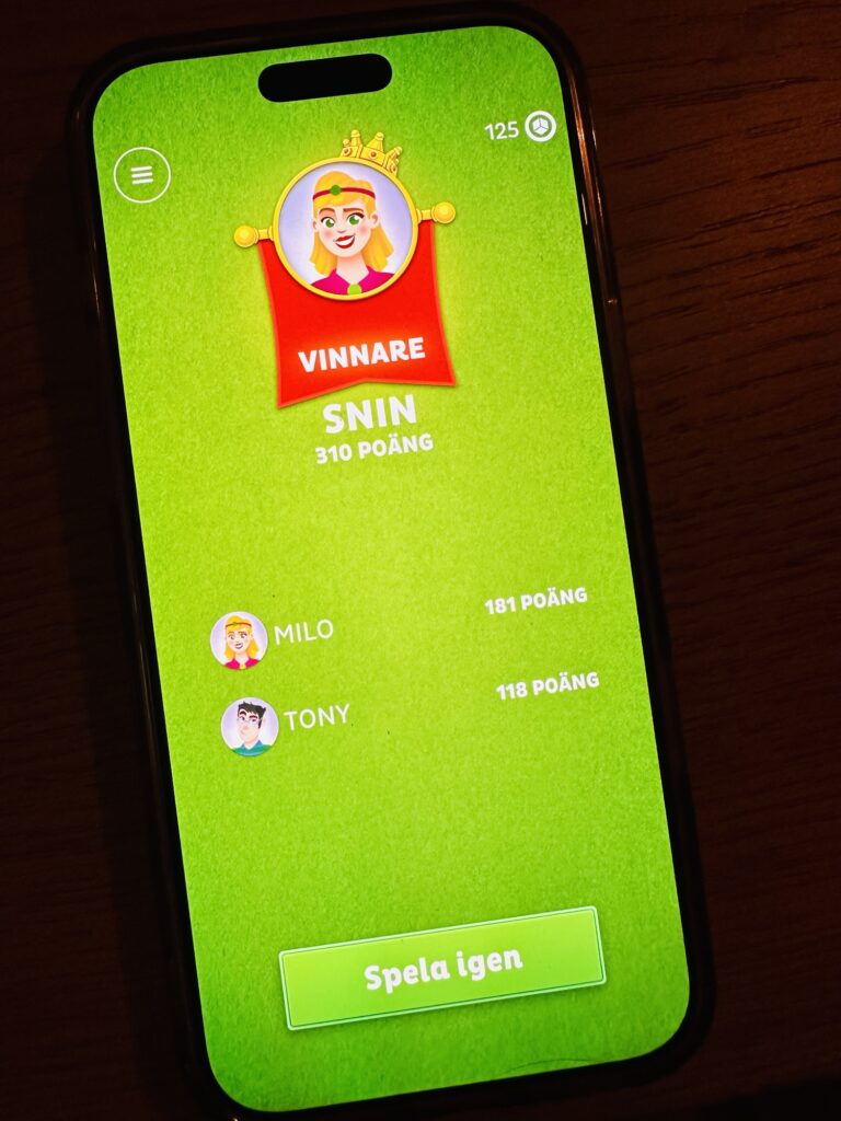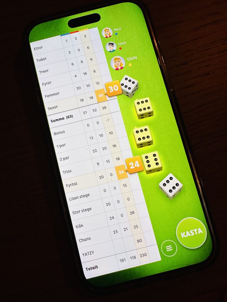 I lördags åt vi lunch hemma vid matbordet och sen skulle en YATZYmatch avgöras. Haha, det gick galet bra för den här mamman. Även om mitt namn ser lite konstigt ut så vann jag. Fick 5 stycken 6:or 2 ggr i rad. Var nämligen riktigt illa ute innan det men serru det löste sig.