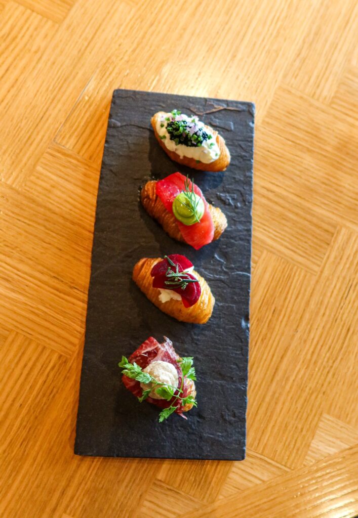 Fick smaka deras fantastiskt goda hasselbackspotatis. En med smetana, en med lax, en med rödbeta och en med kött. Så himla gott!