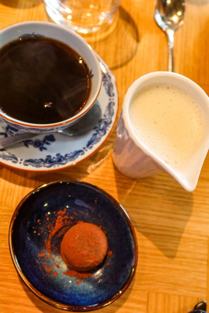 Jag åt röding med fänkålssallad och Sandefjordssås, väldigt gott och fräscht med salladen till. En liten pralin till kaffet blev det också. Fanns koffeinfritt kaffe och jag fick också skummad havremjölk till. Så fint!