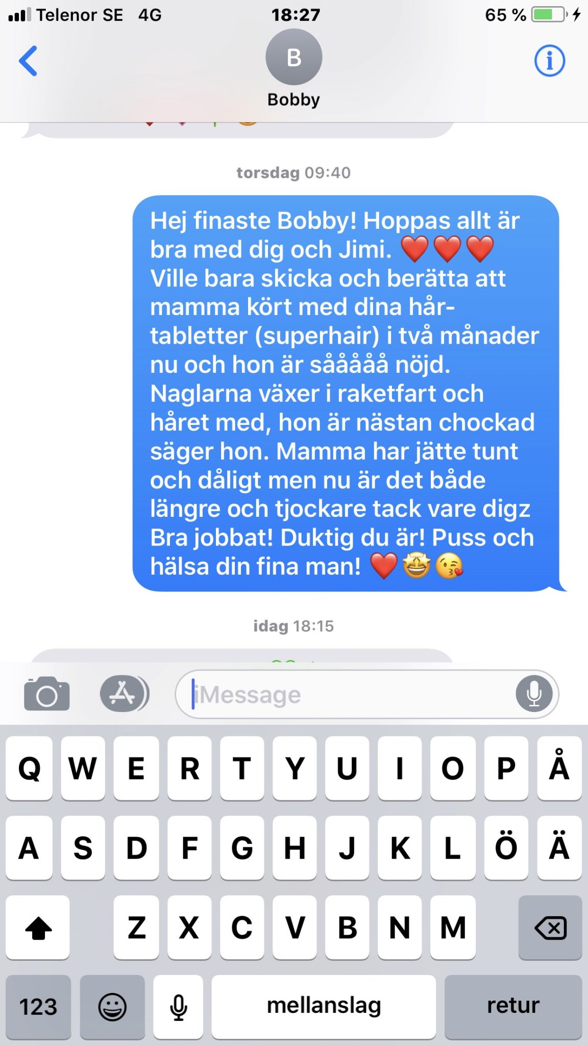 Mamma har kört med Bobbys Superhair i 2 månader. Hon blev påverkad av reklamen och ville testa och köpte tillskottet. Häromdagen så berättade hon att hon kört i 2 månader som sagt och att hon var såååå nöjd. Mamma har problem med både torrt och tunt hår och nu hade det blivit sån otrolig skillnad. Mamma har aldrig hittat nåt som funkat för hennes hår så jag är verkligen glad att det här funkar på riktigt. Jo, sen visade hon naglarna också och de har också vuxit massor.