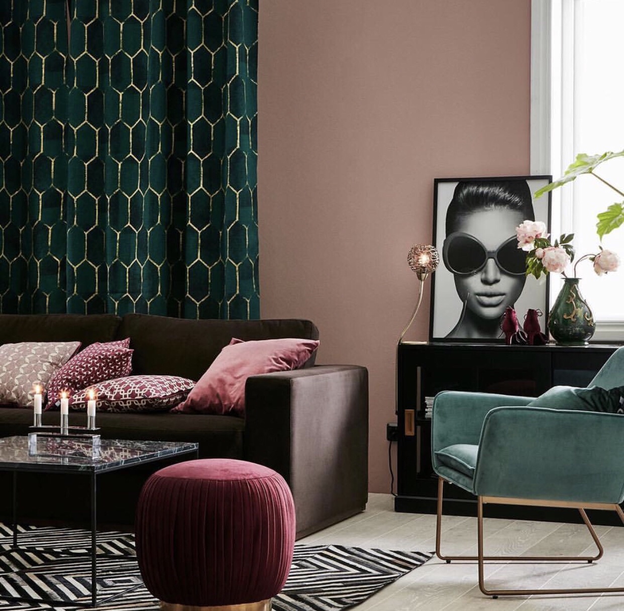 Kolla in dessa snygga fåtöljer också. Kika också in de fina sittpuffarna med mässingsbotten som finns i flera färger. Det fantastiska marmorbordet är ”to die for”. Sånt vill jag ha!