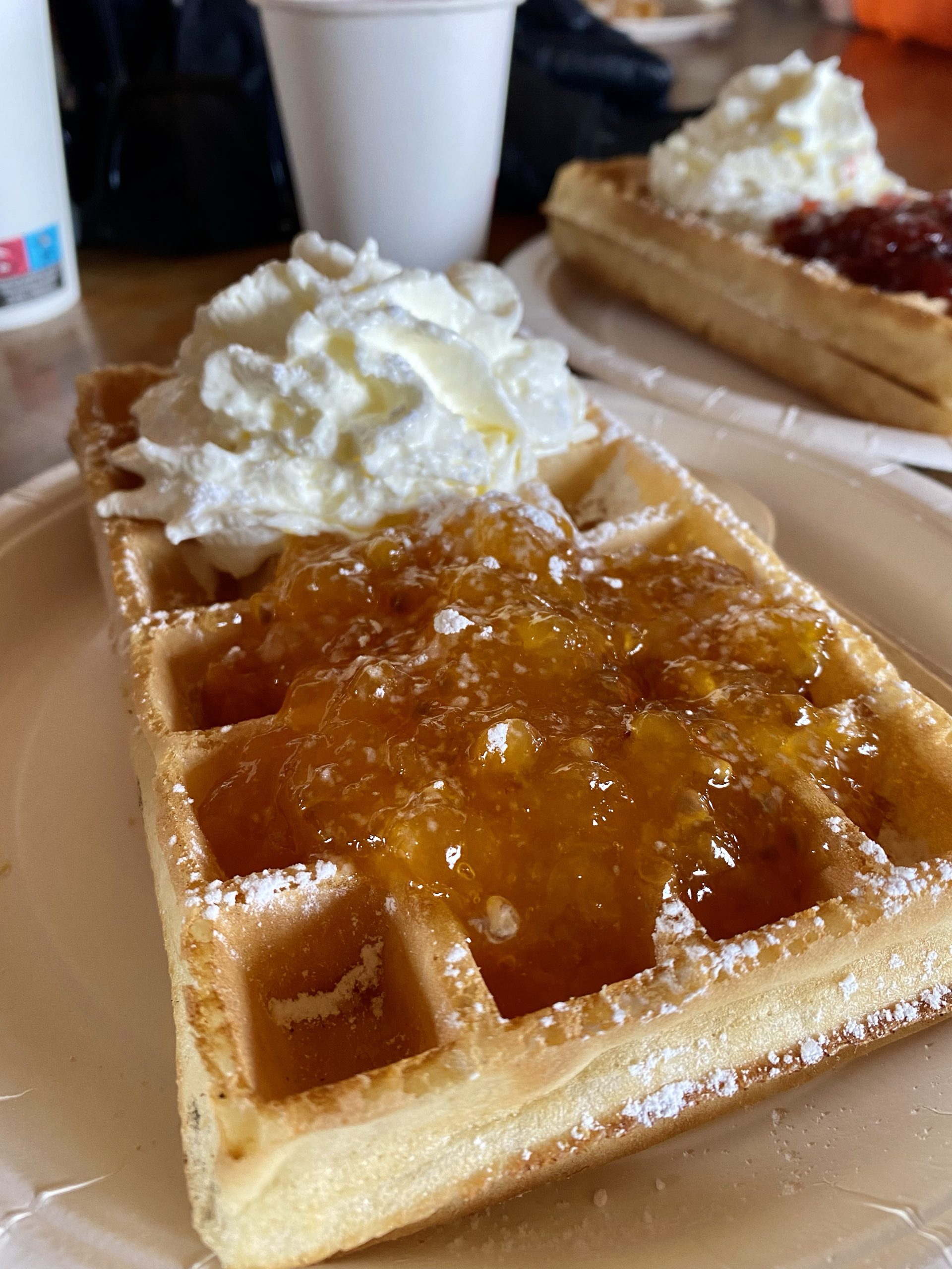 Varm choklad, blåbärssoppa, våfflor med både hjortron och jordgubbssylt. Jag tog två våfflor. Haha, ja men jag är stor i maten. Sen kunde jag inte bestämma mig för jordgubbs eller hjortronsylt. Skulle heller aldrig bli belåten på en sån liten våffla som är mer eller mindre bara luft ju. Ingen annan tog 2 dock….. haha! 🤣