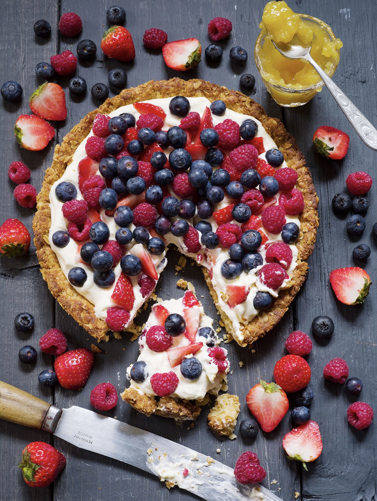 4) Ta ur bottnen ur formen, fördela fyllningen ovanpå och garnera sedan med bären. Servera & njut!