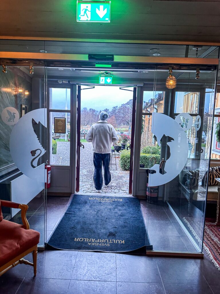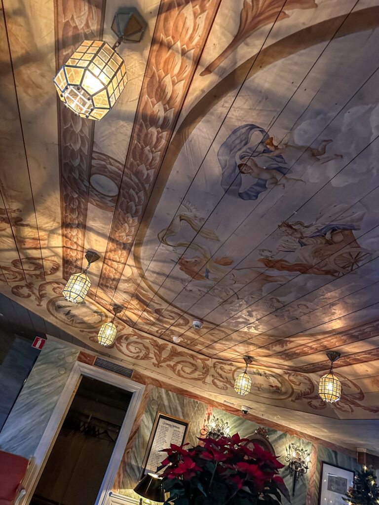 Innan vi tackade för oss så fotade jag ingången till värdshuset. Så himla fint uppe i taket va? Är alldeles svag för konst i taket, skulle jag få skulle tapetsera alla tak hemma med. 😀