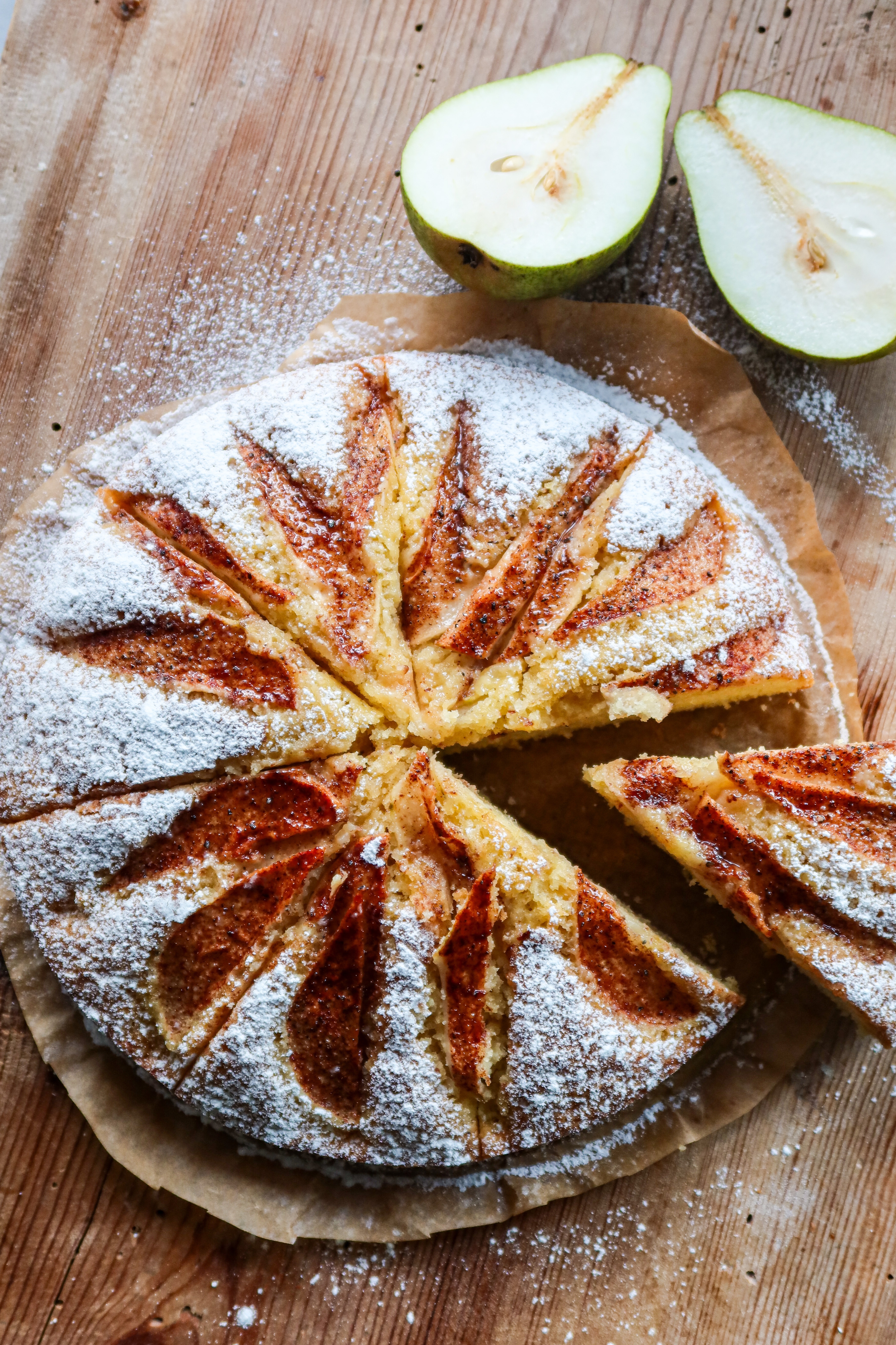Varför har jag inte ägnat mitt liv åt att baka päronkakor hela dagarna? 😂 Nej men hallå i gatan vad smarrigt det skulle vara med just denna himmelska päronkaka. Lite som att jag fr.o.m nu måste baka det varje vecka. Mamma och pappas päronträd där hemma har verkligen varit överfullt av päron, så i veckan var jag och plockade en hel påse. Nu blir det päron i allt hemma ett tag. Denna päronkaka är busenkel att baka, det går i ett nafs för det första. Du behöver inte vispa ägg och socker i en halv evighet utan bara blanda ihop, skala lite päron och så dekorera och på med den magiska kanel/råsocker/vaniljsocker/kardemumma blandningen. Jag säger bara heja heja så gott!