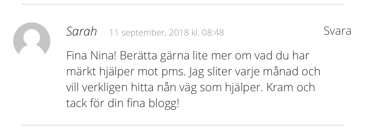Tack för att du delar med dig om detta. Du har ju skrivit om det förut och jag vill bara tala om att tack vare att du berättar om det så har det hjälpt mig att förstå det som min man tjatat om i 10 år nu, att jag blir jättepåverkad när jag har PMS. Så jag har äntligen sökt hjälp och ska få träffa en läkare på gyn 1 oktober, och det är tack vare att du varit så öppen med detta Nina!