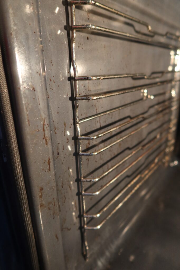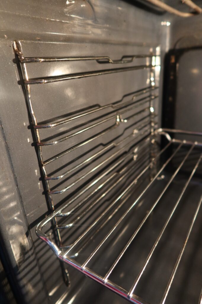 Låt det svalna, sedan är det bara att ta kokosborsten med lite mer koncentrerad såpa och löddra upp det och borsta igenom hela ugnen. På de tuffaste fläckarna kan man använda skrapan lite försiktigt. Sedan är det bara att torka av hela ugnen med trasan.