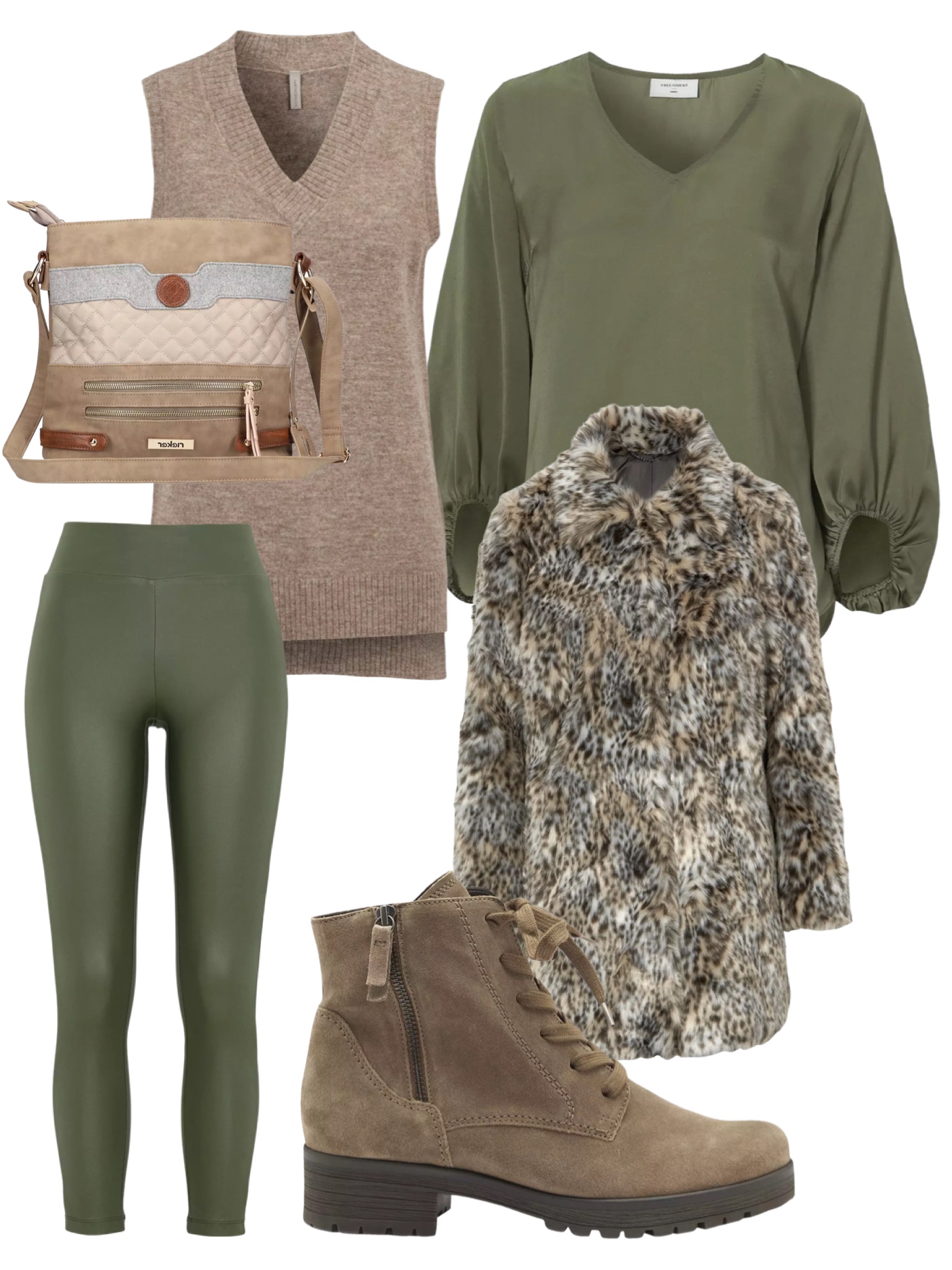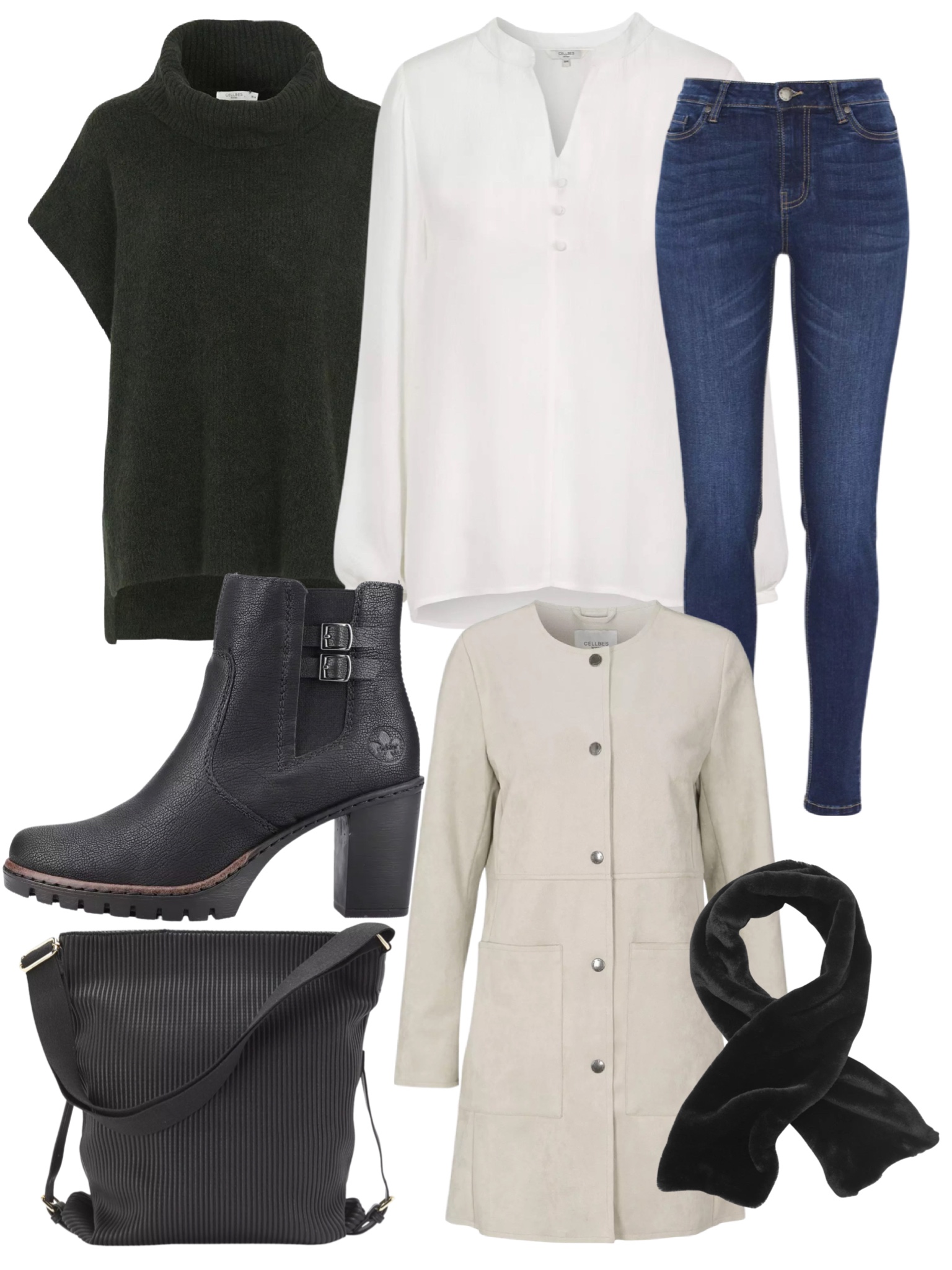 Poncho // Blus // Stretchjeans // Stövlett Jacka // Väska // Krage i pälsimitation