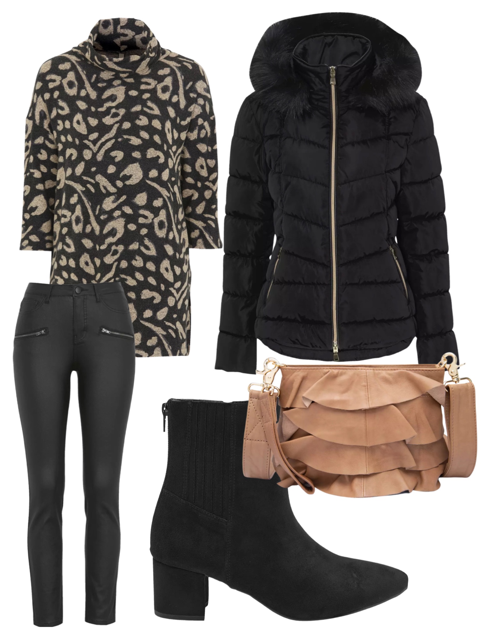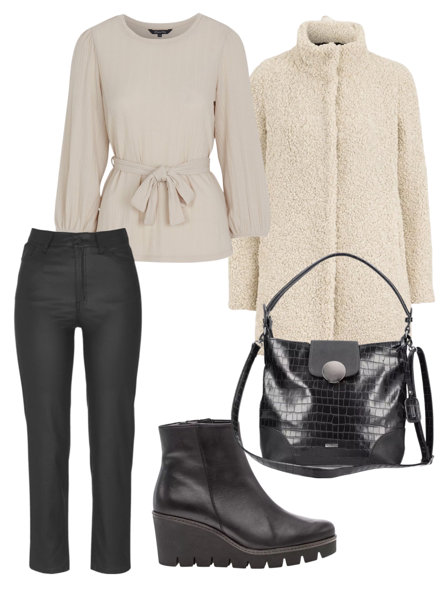 Tröja med knytning // Coatad byxa // Stövlett // Väska // Jacka