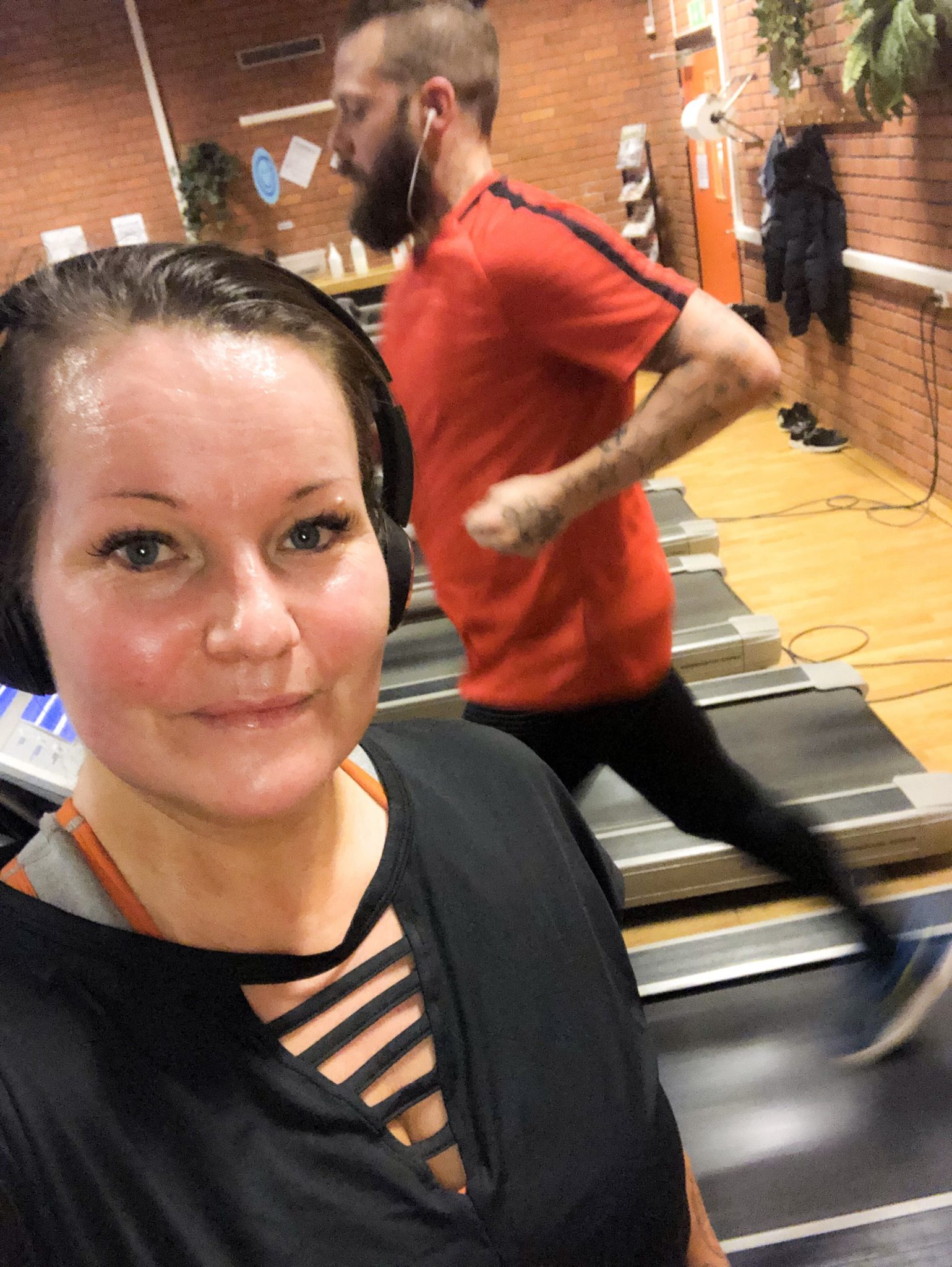 Igår lunchtränade vi som sagt. Jag sprang 4 km på bandet. Tog nästan 34 minuter så jag är ju ingen snabbis. Men jag stressar inte med det alls. Är bara så jädrans glad att jag orkar springa så långt utan att stanna en endaste gång. Tony däremot sprang 6 km på typ 32 minuter. Han började efter mig så det är därför han springer i bakgrunden. Sedan körde jag mage och stretch. Måste vara noga med stretch.