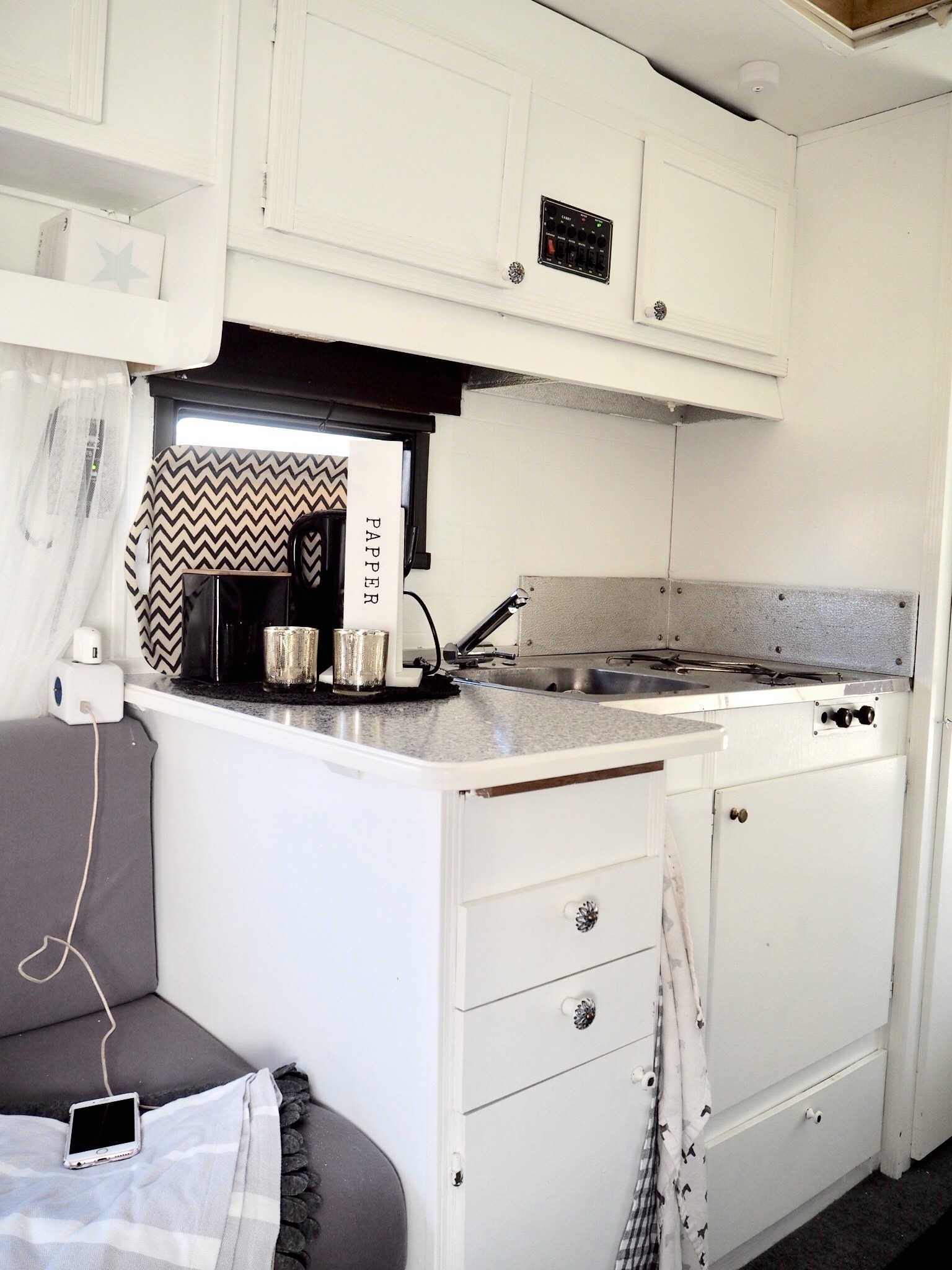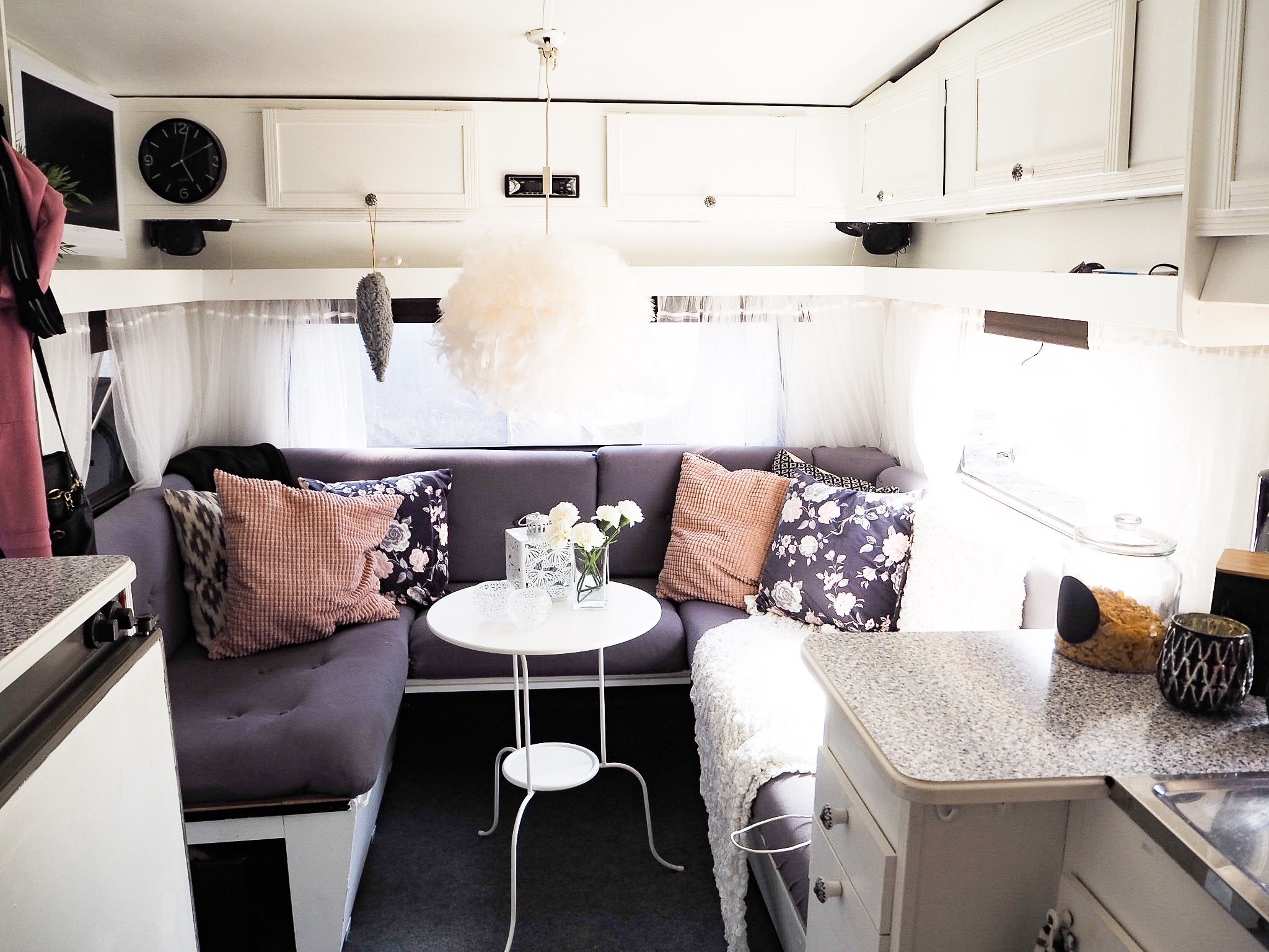 Blev en rätt rejäl förändring?! Ljust och fräscht, ett litet utrymme som husvagn är kräver lite ljus så det känns rymligare och större. På golvet la jag en ”heltäckningsmatta” – egentligen en balkongmatta. Blev hur bra som helst.