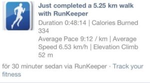Precis avklarat 5,25 km här på morgonen. SHAJSSE vad jobbigt det var! Trodde knappt jag skulle komma hem…det värkte i låren och så kändes det ändå som man stod på stället och gick.