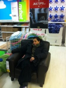 En trött mamma i lekhörnan på IKEA.