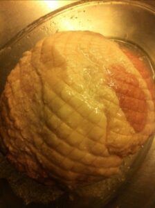 Nej, detta är inte Tonys högra pungkula utan detta är vår julskinka. Ursäkta mig men dom ser INTE särskilt trevliga ut när dom inte är klara så att säga. För att inte prata om när dom ligger och simmar i den där fläskfyllda lagen. Usch…