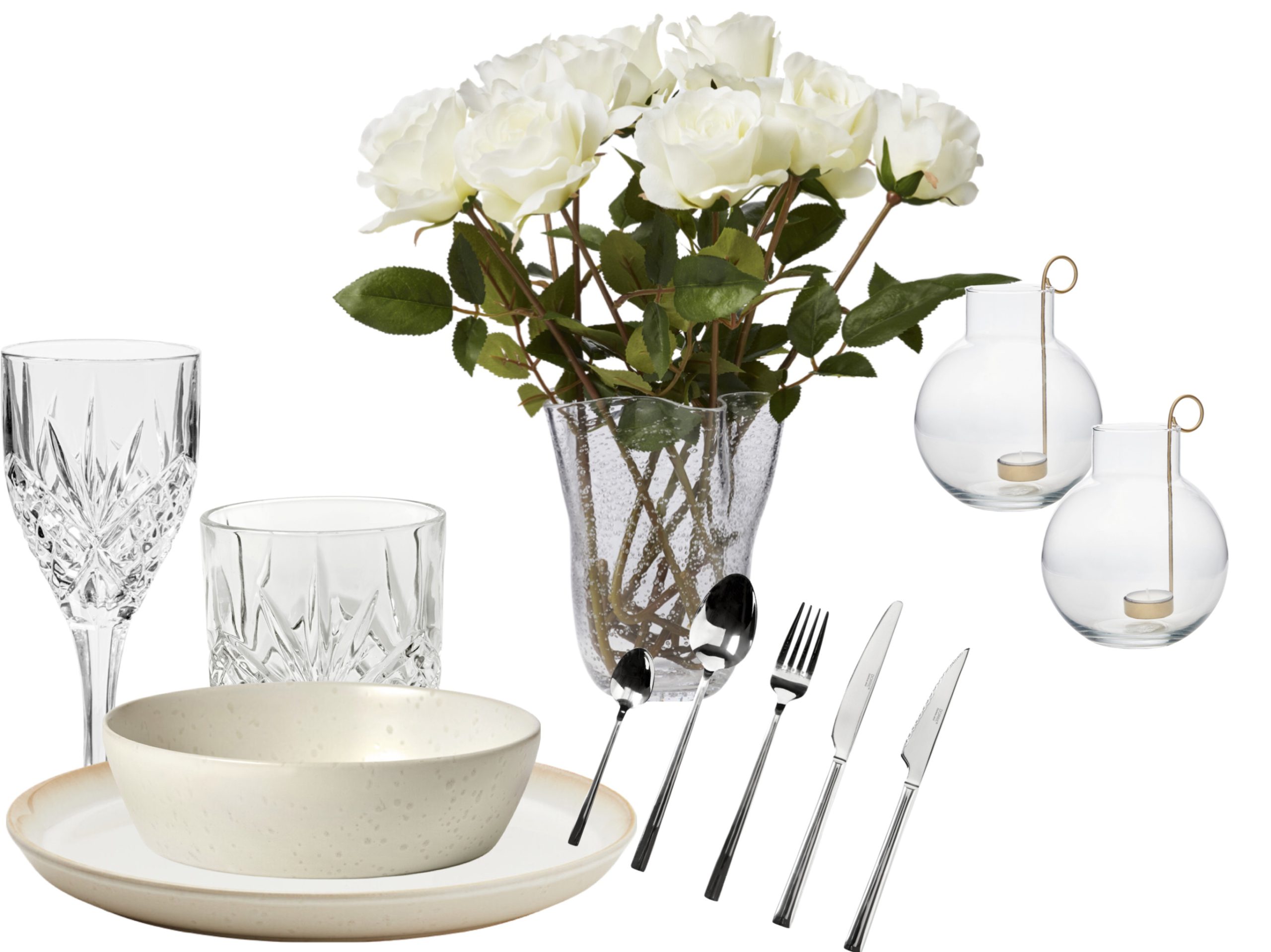 Tallrik // Djup tallrik // Bestick // Vinglas // Drickglas // Vas // Ljushållare