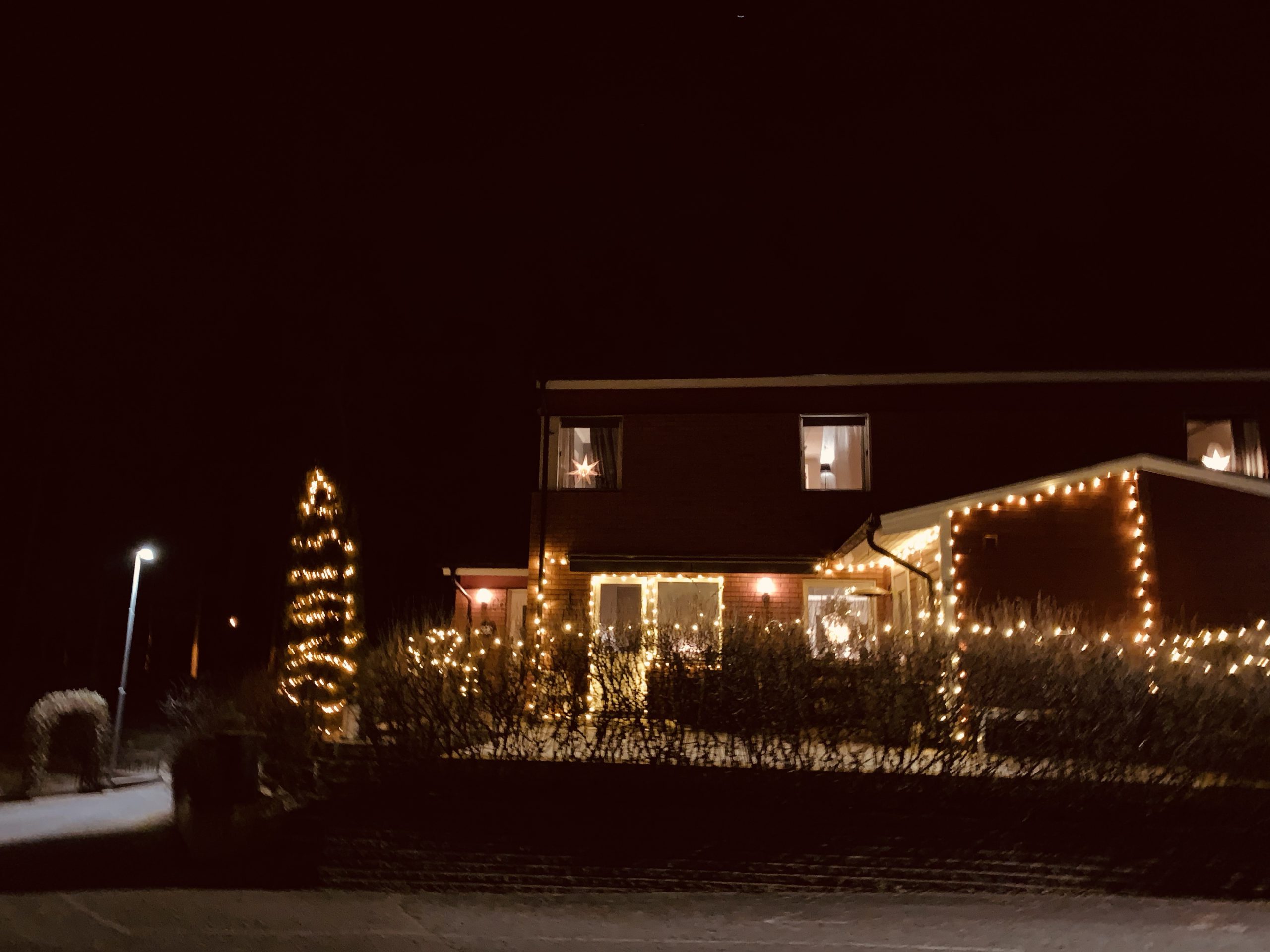 Vi har julpyntat järnet nu. Utomhus så ser det ut som man kommer till en sån där amerikansk gata där man gått bananas med julpyntningen. Så går det när man skickar ut karln med över 50 meter ljusslinga. Haha….