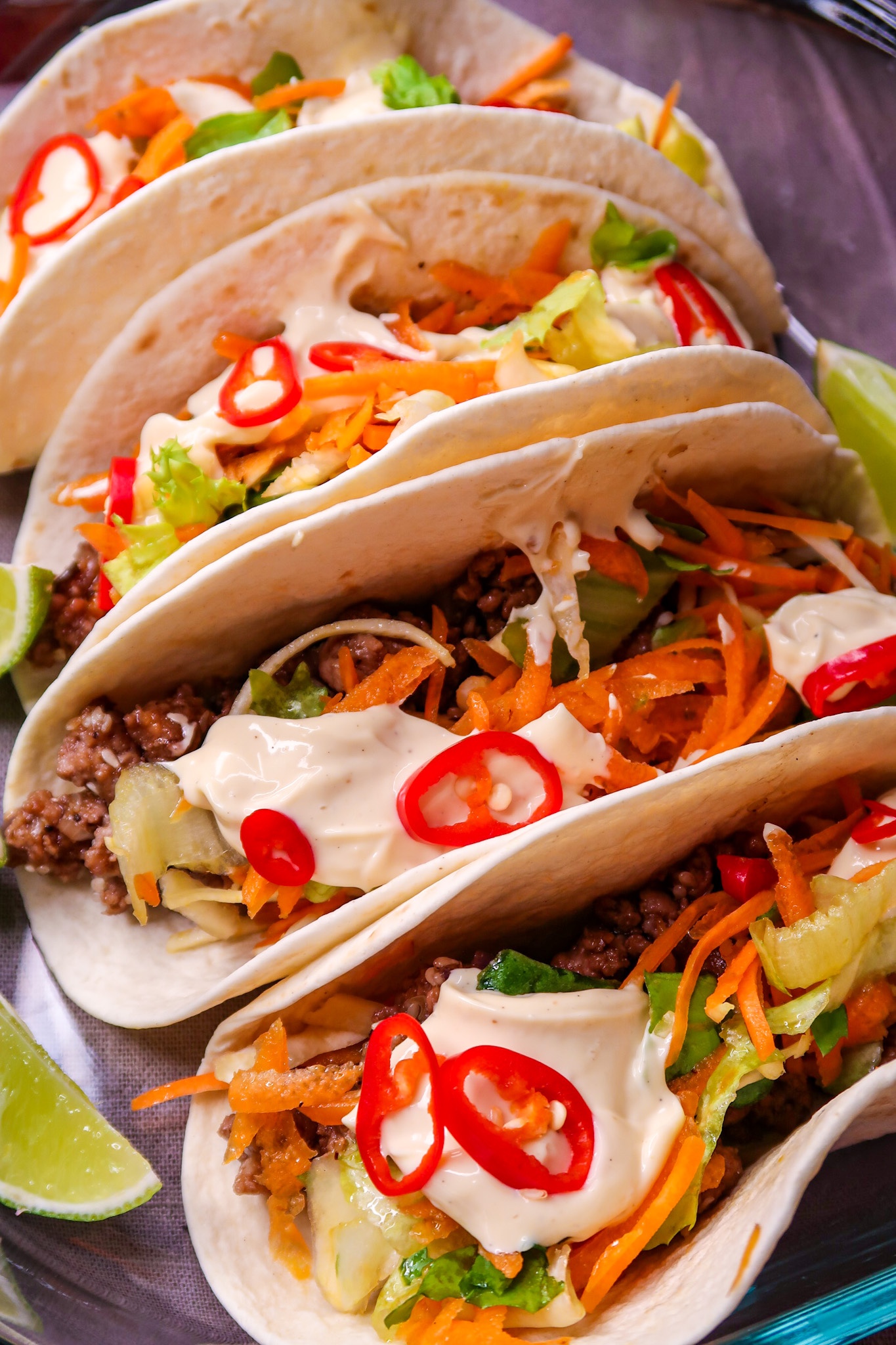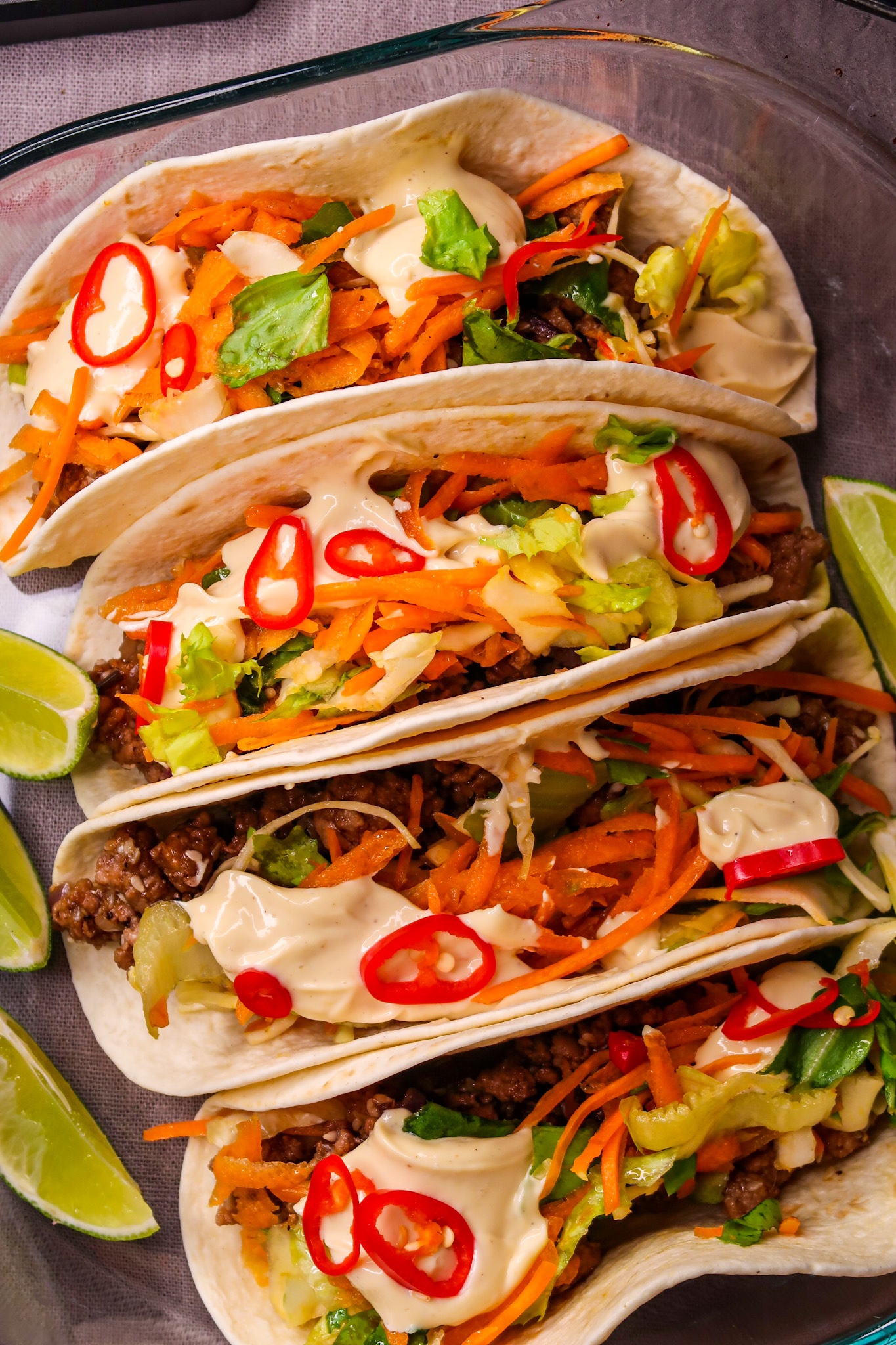 6) Preppa färdiga tacos med blandfärs bladningen, strimlad salladsmix och asiatisk majonnäs över. Avsluta med några chilisar på.