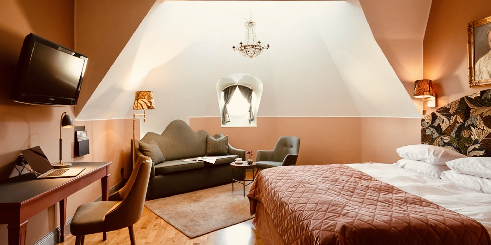 Vårt rum var det här rummet, man bäddade ut en bäddsoffa till Milo så alla fick bra plats. Det där tornet med fönstrena högt upp var något alldeles speciellt.