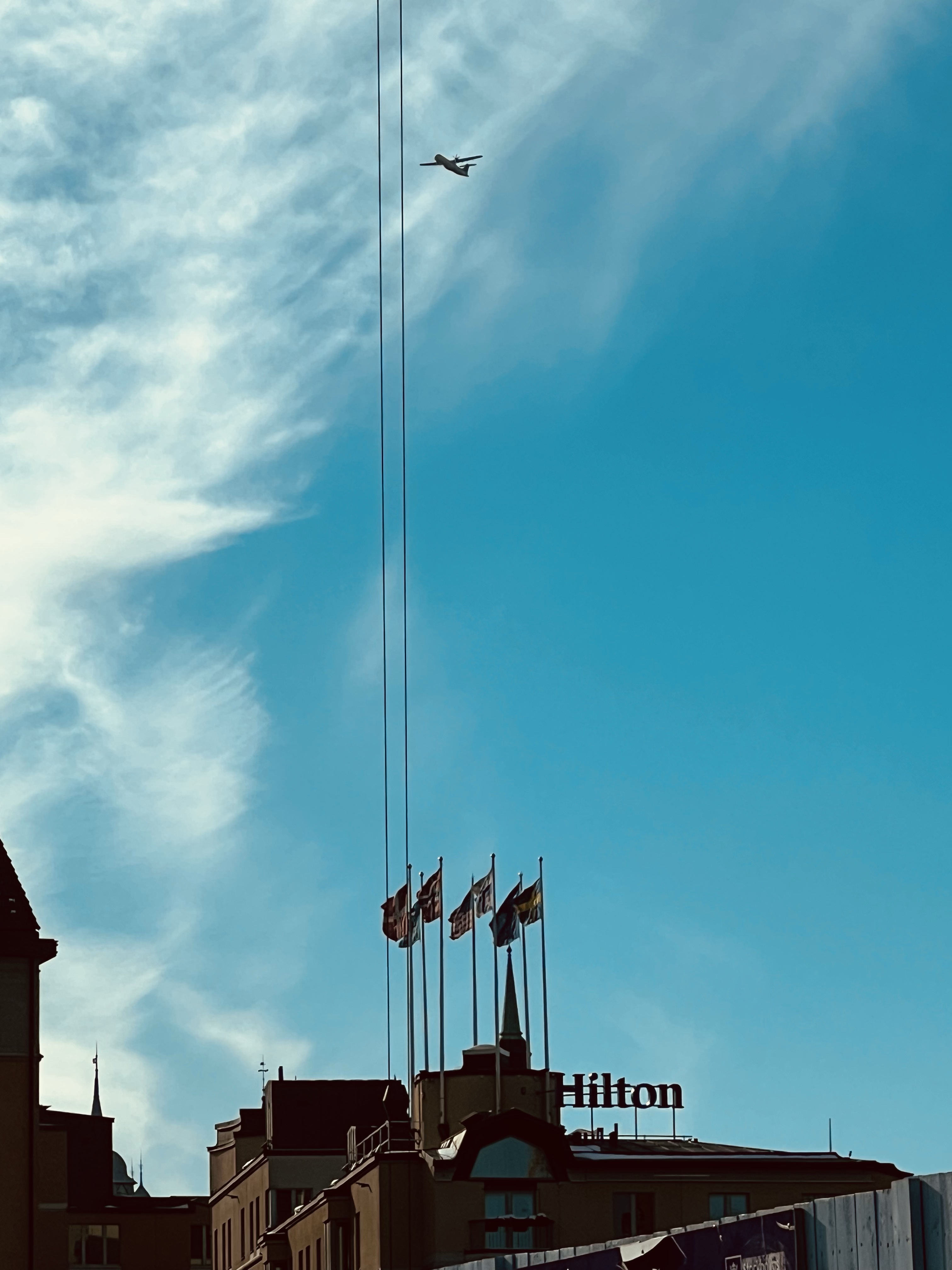 Vi Katarinahissen fångade jag denna bild av Hiltons flaggor och flygplanet i luften.