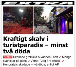 Läser Aftonbladet, läser Expressen. Får inte fram så mycket mer info. Men epi-centrum har varit vid ön Kos. En mil under havet. Där har två dött och hundratals skadats. Jordbävningen har räckt ända till Rhodos där Thedde är läser jag. Flygplatsen på Rhodos är evakuerad. Det har också varit mer än 13 efterskalv med efterföljande tsunamis.