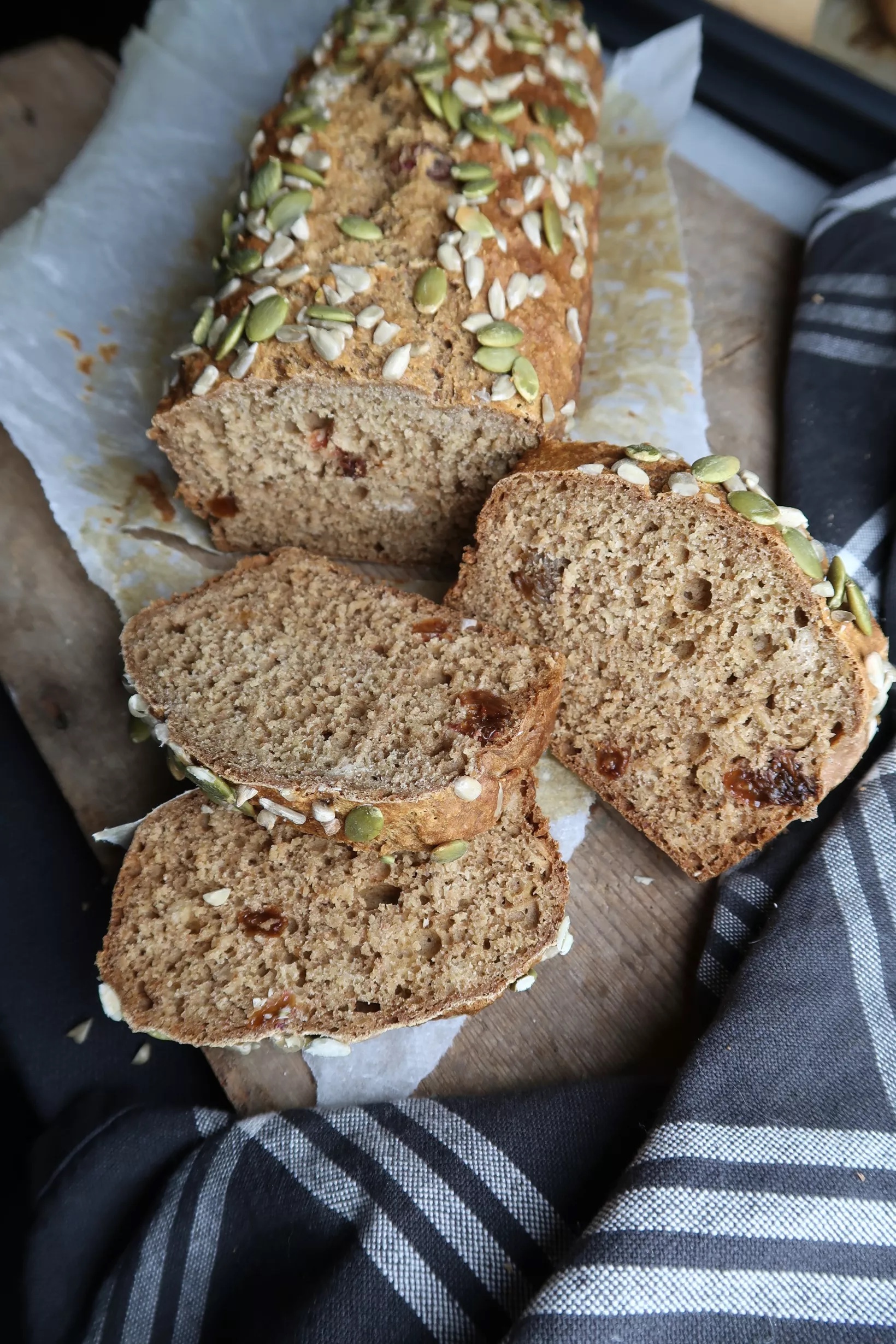 2) Lägg bakplåtspapper i botten på en brödform. Häll i degsmeten där. Toppa med solrosfrön och pumpafrön.