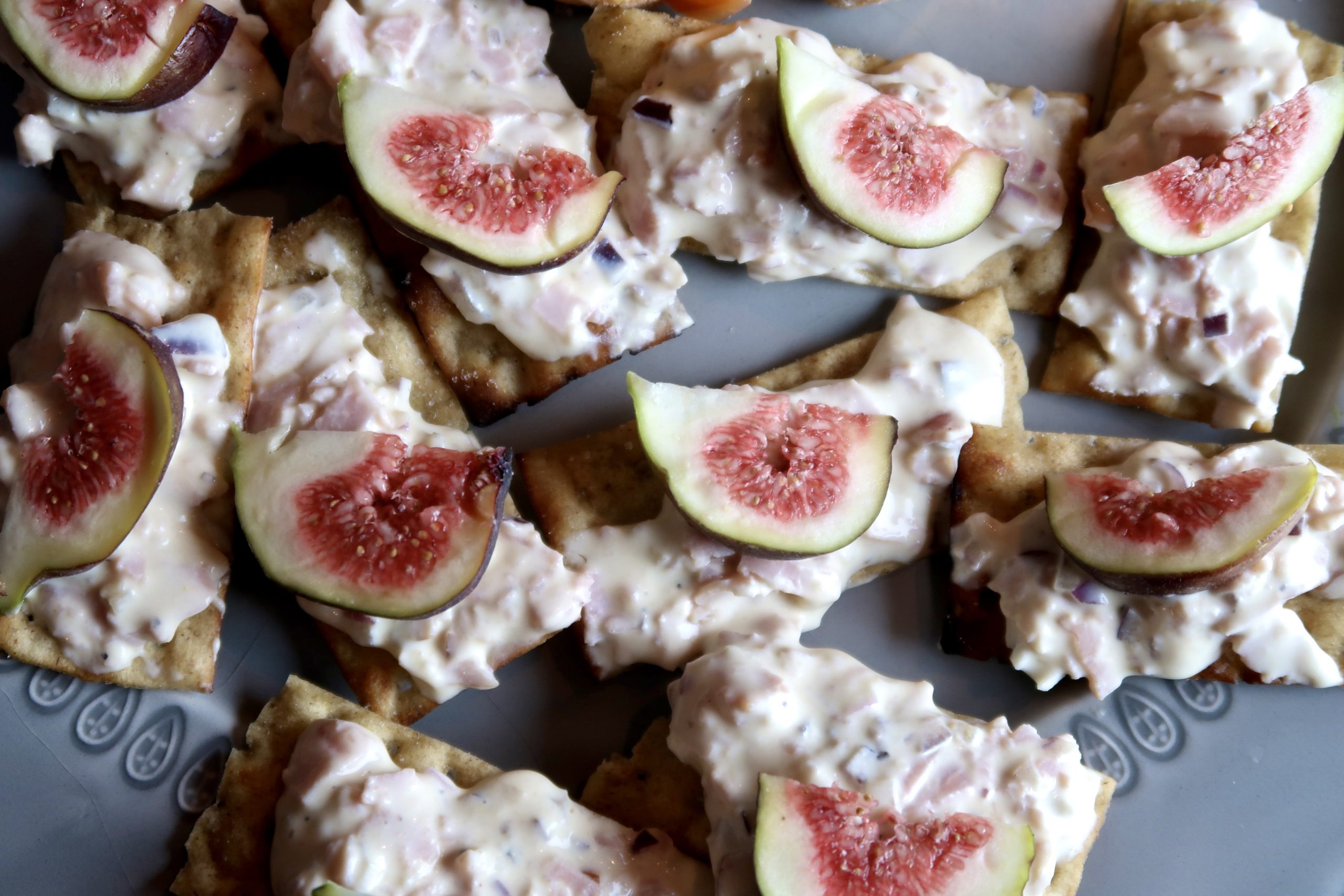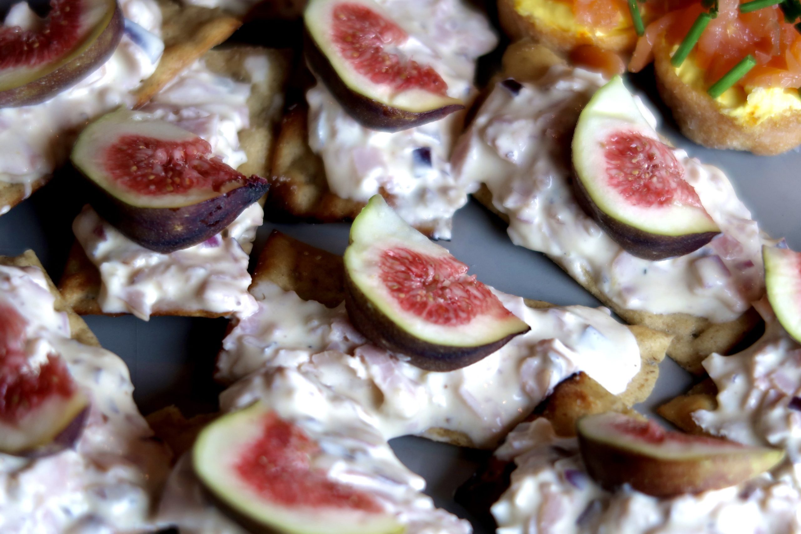 4) Dela knäcket på mitten och ha på röran uppepå. Toppa med en liten klyfta fikon.