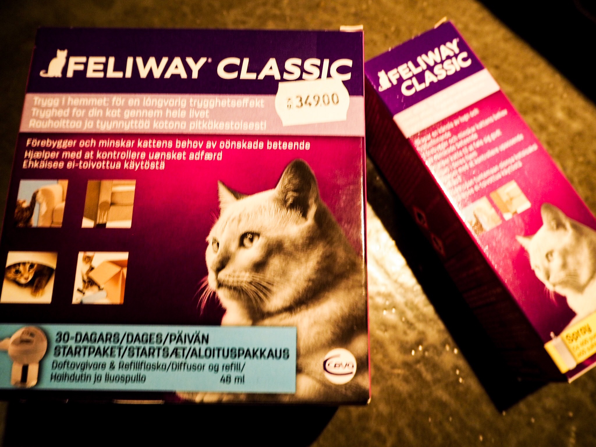 1. Jag tycker Feliway funkar, jag brukar spraya det när vår lille katt ”kloar” på nått ställe som han inte skall. Lycka till med Majlis och bilfärden.